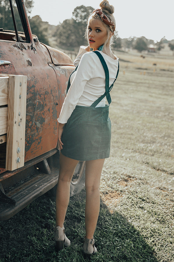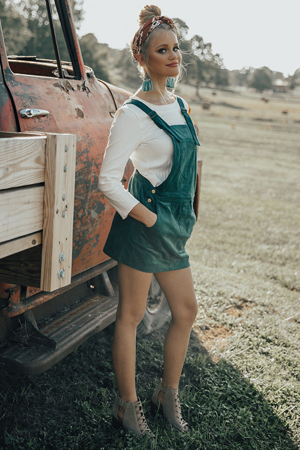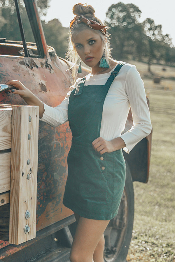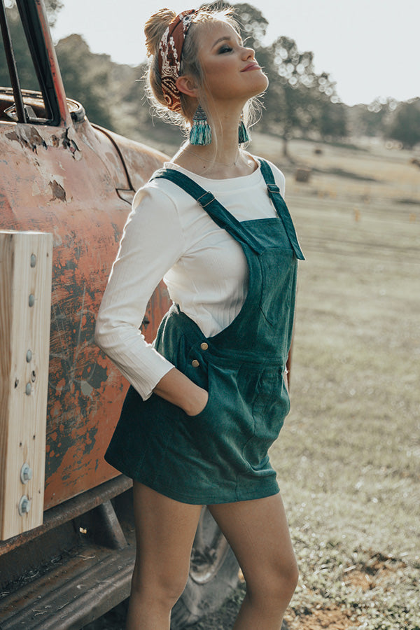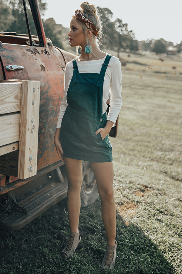 The "Strolling Through Brooklyn Overall Dress" is the perfect blend of old & new school! This woven overall dress has a pocketed bib front with adjustable straps that criss-cross in the back, & a pocketed skirt with button-down sides & a sassy mini-length hem. It's dark teal hue & velvety feel give this dress a retro old school feel, while it's slim figure-flattering silhouette & mini length hem add the perfect modern twist. Pair this overall dress with a fitted thermal or turtleneck, for a trendy transitional look that's sure to steal the show wherever you go!