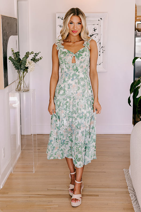- Go wine tasting in this sweet dress! - Chiffon material with an abstract floral design featuring greens and orange hues - A v-cut neckline - A sleeveless cut - Ruffled elastic straps - A cut out detail under the bust - A smocked back detail - Side zip detail - A semi-sheer skirt lining flowy silhouette that ends in a midi length hemline