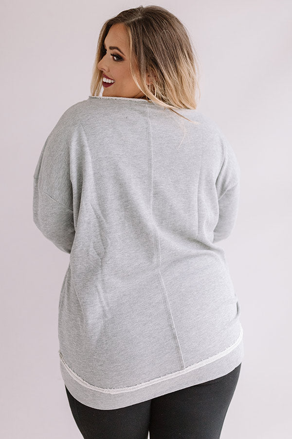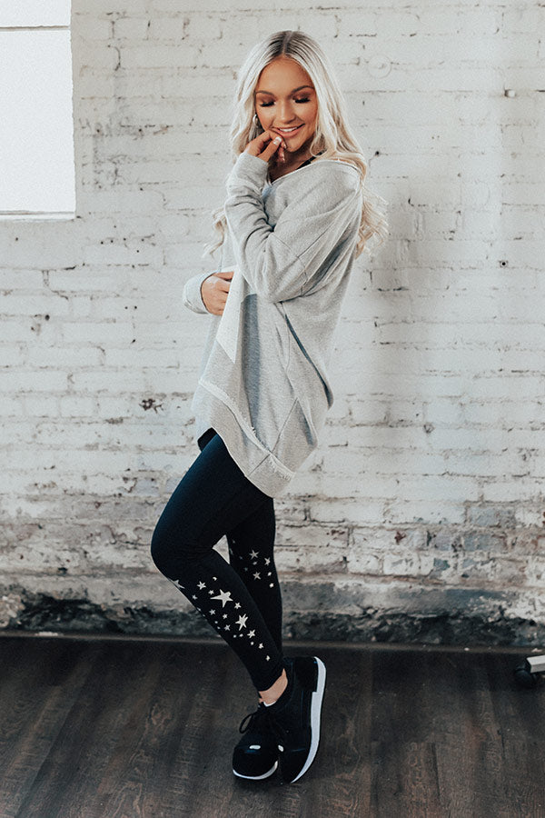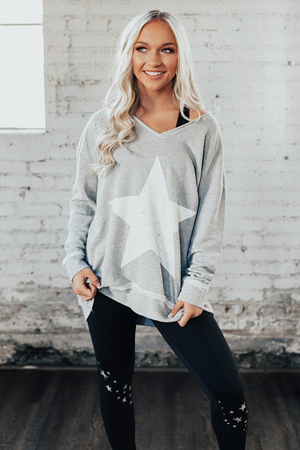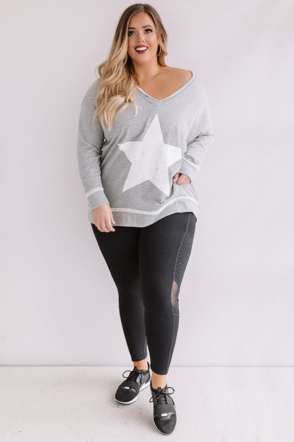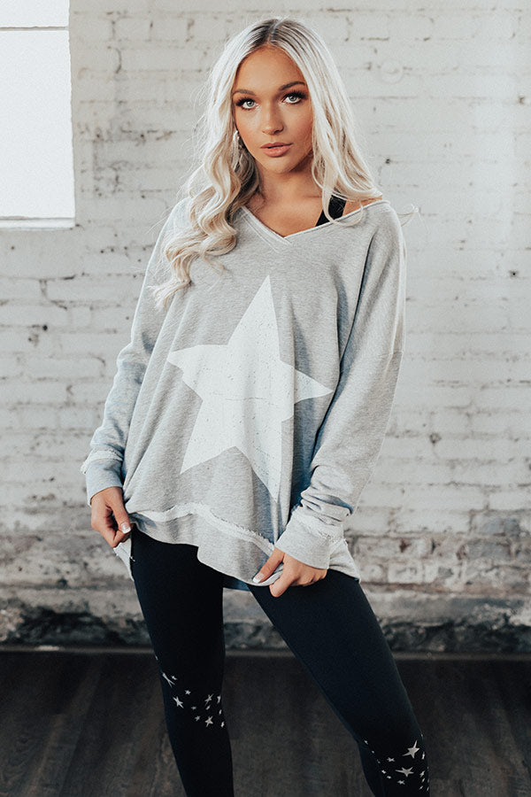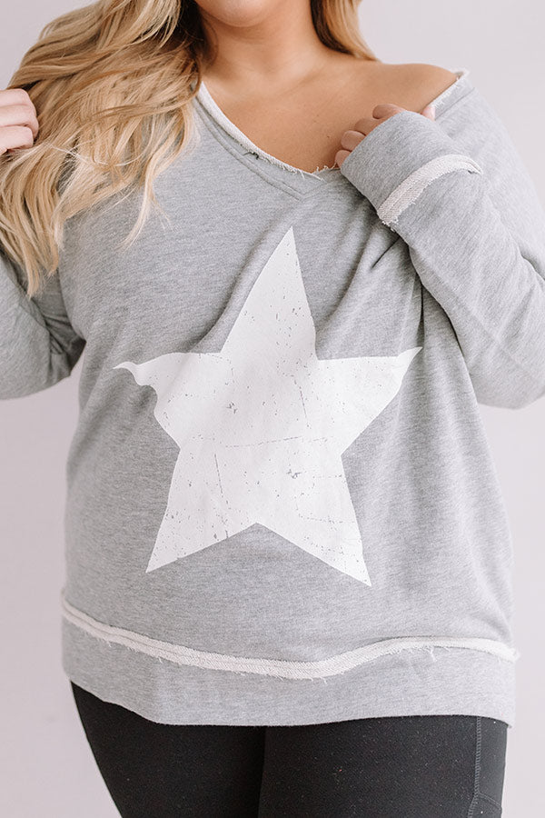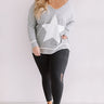 Plus Size - Show off how "strong and confident" you are with this adorable grey tunic sweatshirt featuring soft lightweight material, long loose sleeves, a wide v-cut neckline that can be worn off one shoulder, a large white star on the front, exposed accent seams, and a relaxed silhouette that falls into a straight upper thigh length hemline! You can dress this piece down with some black leggings and trendy sneakers, or you can style it up with some distressed light wash ankle skinnies, our "Bryant Park Views Quilted Crossbody in Blush," our "All Caught Up Headband in Ivory," and "The Saylie Peep Toe Heel in Blush!" Measurements