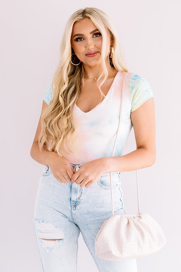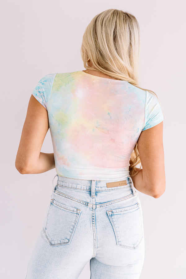 You are sure to have "strong feelings" for this adorable bodysuit featuring soft lightweight stretchy material patterned with pastel tie dye, a v-cut neckline, short loose sleeves, and a form fitting silhouette that falls into cheeky fit bottoms with a snap button closure! You can style this versatile piece under any type of bottoms and wear any type of outerwear with it for a variety of looks that will carry you from season to season!