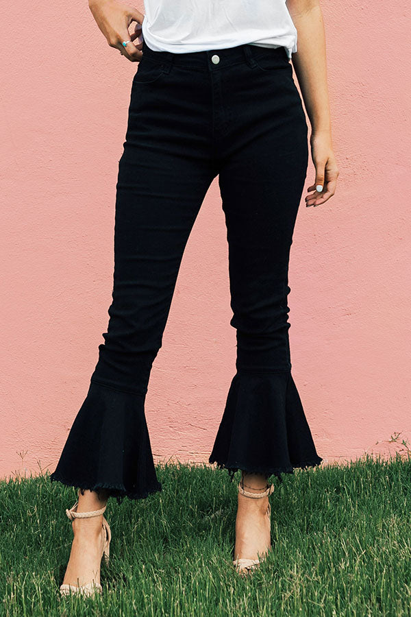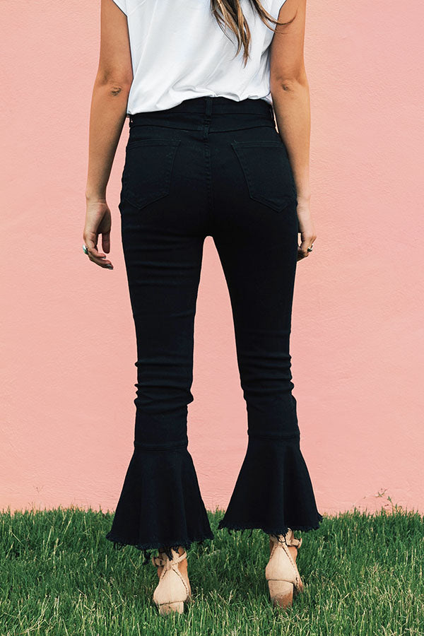 These black cropped flare jeans have a flattering high waisted fit & an ultra retro flared pant leg with a raw cropped hem.
