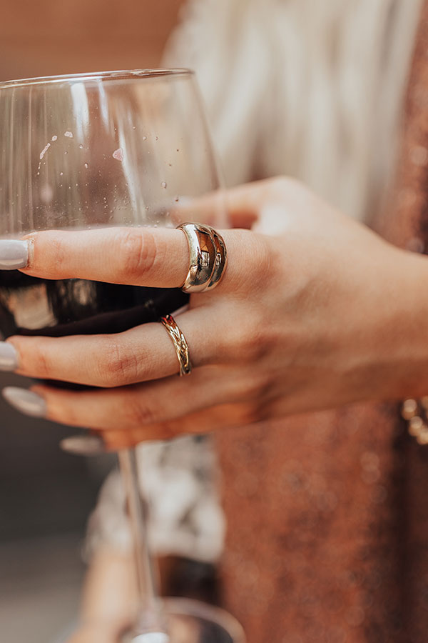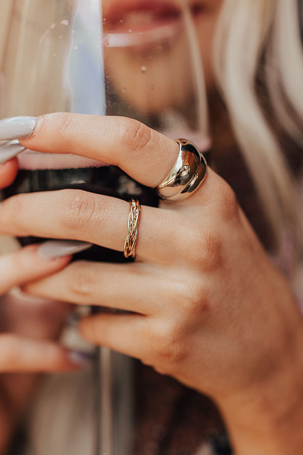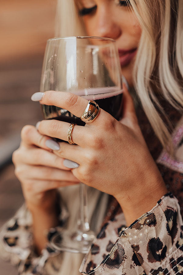 You are sure to stun the crowd when you accessorize with this luxe gold ring set featuring a wide double bubble band and a dainty stamped band! This ring can comfortably fit between size 6-7.