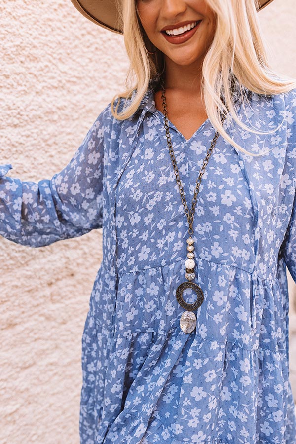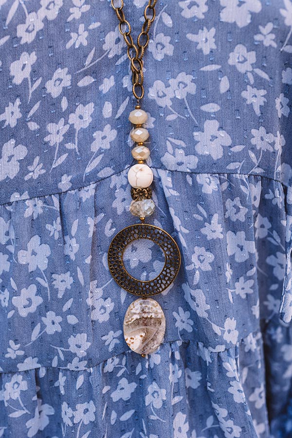 Finish off your look with this stunning necklace featuring a longe bronze chain with white and pearl beads, a metal accent hoops, and a large earthy hued stone pendant!