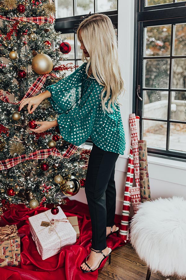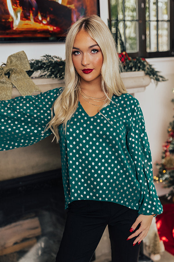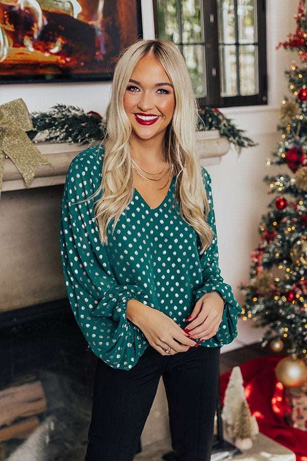 Add a fun pop of print to your holiday wardrobe with our adorable hunter green 'Style A La Mode' shift top featuring lightweight material patterned with gold polka dots, a v-cut neckline, log oversized sleeves, and a relaxed silhouette that falls into a straight hemline!