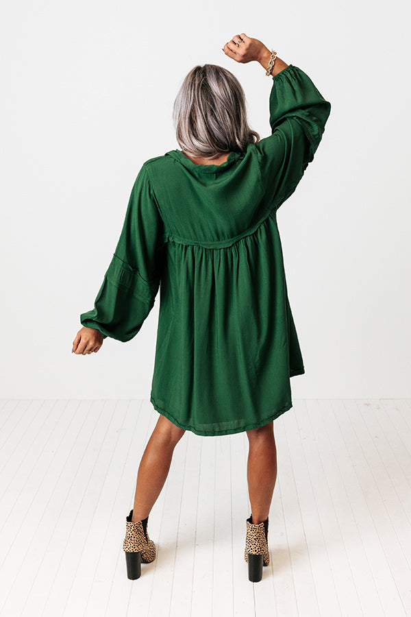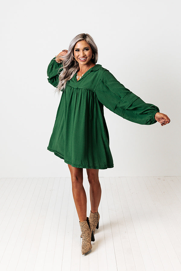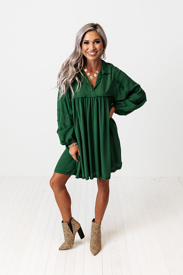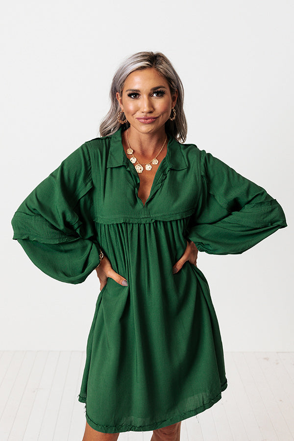People are sure to look to you for style inspo when you wear our charming hunter green colored 'Style Code Dress' featuring lightweight flowy material with exposed raw-cut accent seams, a collared v-cut neckline, oversized bubble sleeves, hidden low pockets, and a relaxed babydoll silhouette that falls into a straight mid-thigh length hemline! Measurements