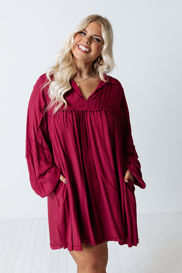 People are sure to look to you for style inspo when you wear our charming wine colored plus size 'Style Code Dress' featuring lightweight flowy material with exposed raw-cut accent seams, a collared v-cut neckline, oversized bubble sleeves, hidden low pockets, and a relaxed babydoll silhouette that falls into a straight mid-thigh length with an unfinished hemline!