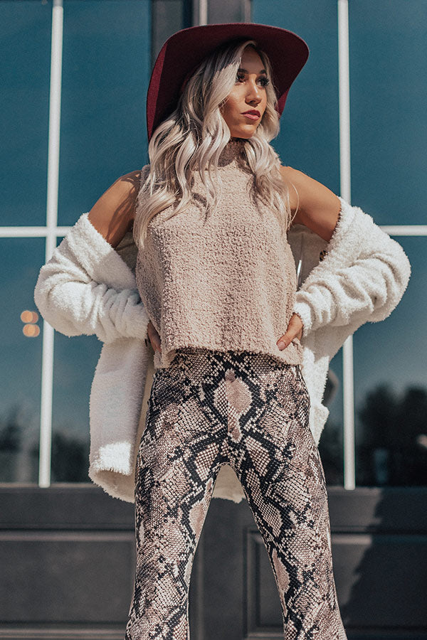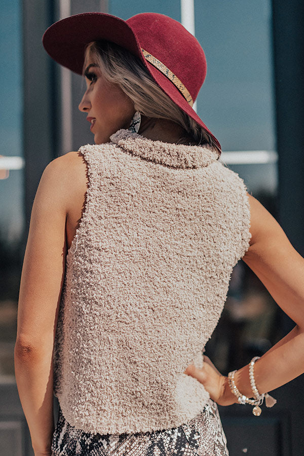 Layer in style this fall with our neutral hued "style edit" sweater tank featuring soft lightweight loose knit material with a fuzzy texture, a high turtle neckline, wide shoulder straps, and a relaxed silhouette that falls into a straight ribbed hemline! We have paired this unique piece under an ivory cardigan with some snake print flares, neutral booties, and a colored faux suede hat, but you can also wear it solo with some distressed ankle skinnies, "The Seraphina Faux Leather Wedge in Taupe," and our "Going, Going, Glam Faux Leather Tote in Taupe!" Measurements