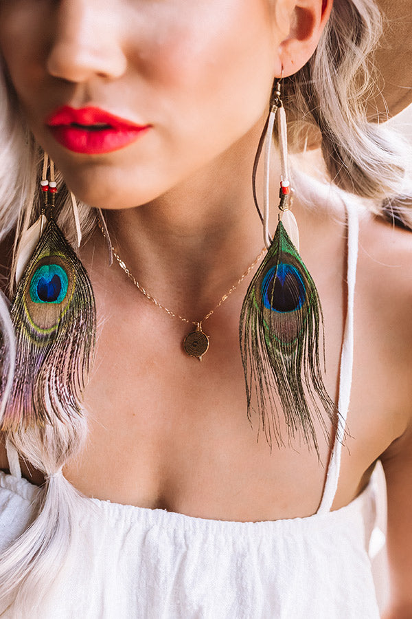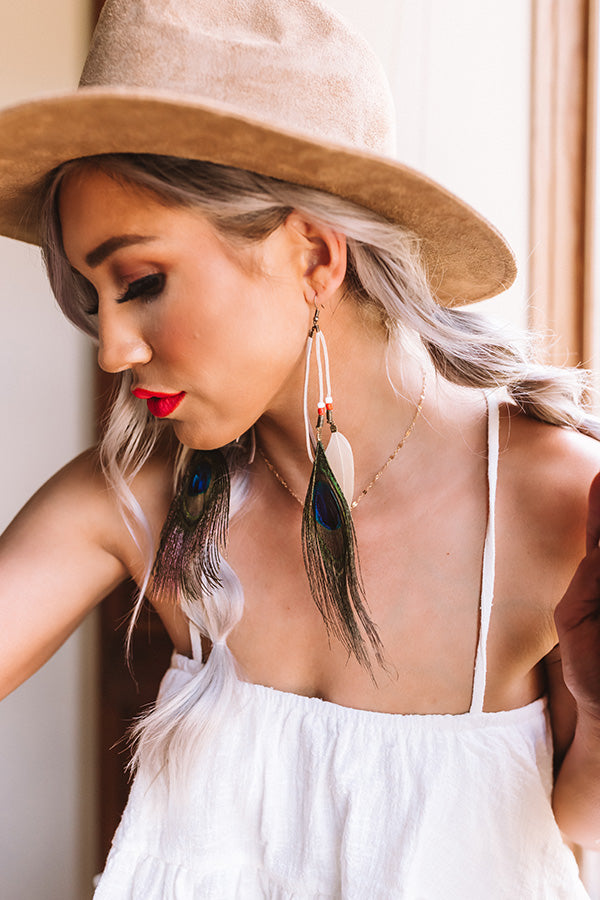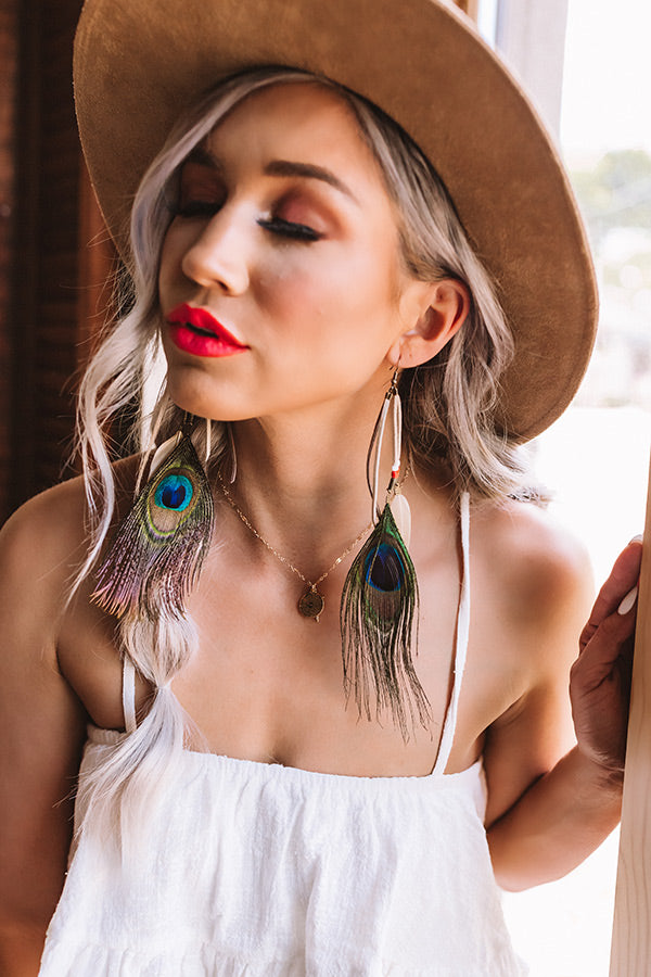 Upgrade your "style essence" by accessorizing with these adorable statement earrings featuring three dangling faux suede strips adorned with large peacock feathers, neutral feathers, and beads!