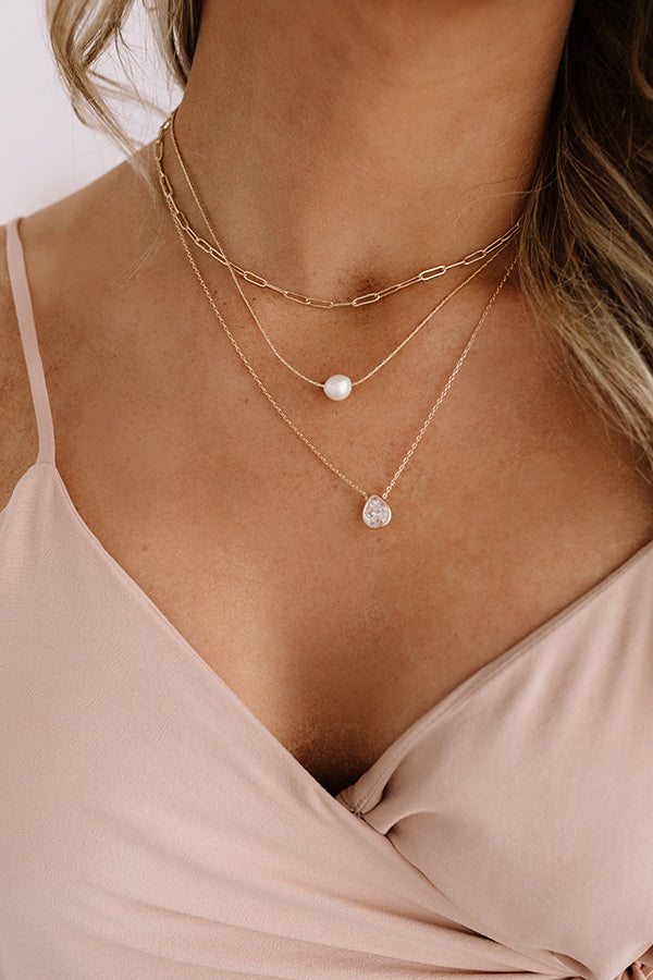 You will truly understand the essence of good jewelry style when you accessorize with this dainty gold necklace featuring three layered pieces with a pearl and rhinestone charm!