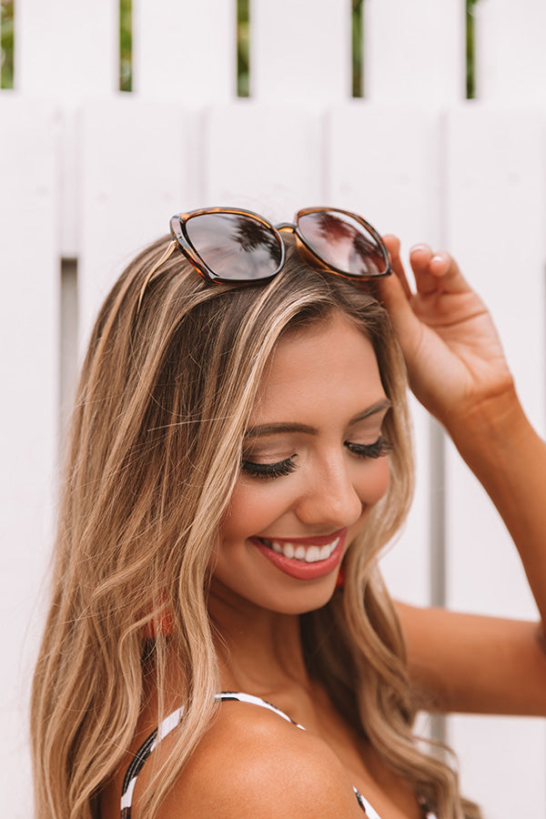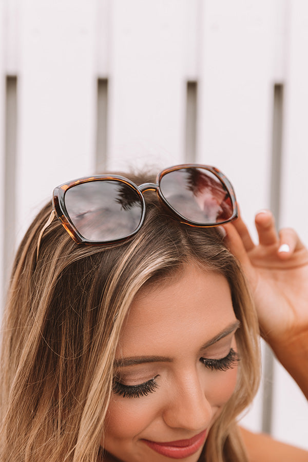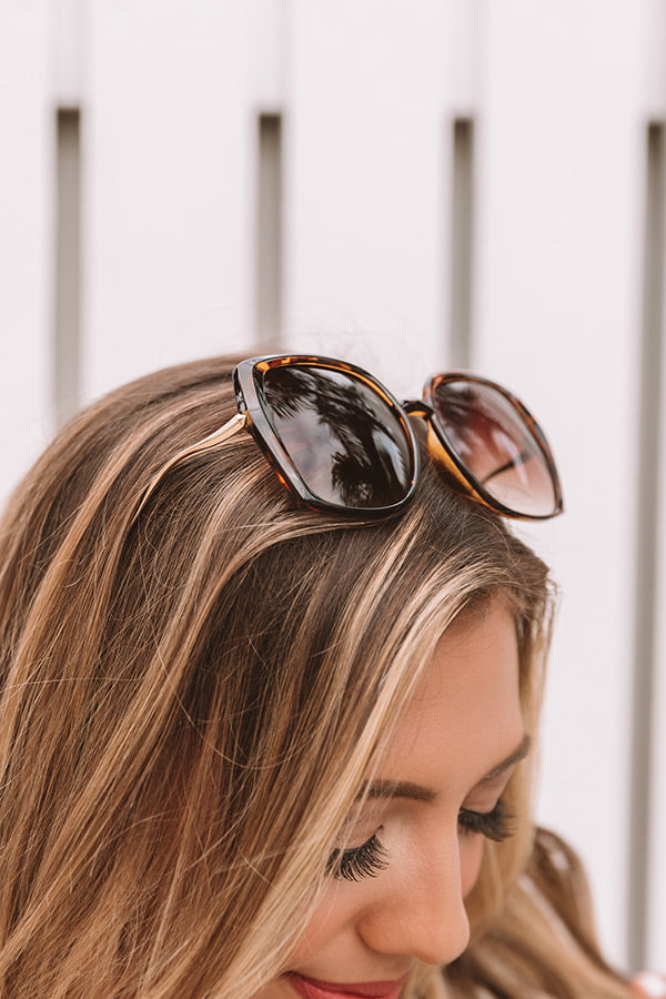 These statement sunnies are an important "style factor" with their thick square frames patterned with a tortoiseshell print, gold wavy earpieces, and dark tinted lenses!