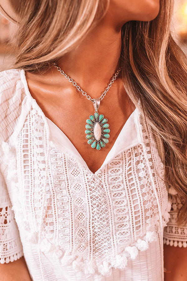 You will undoubtedly be seen as a "style icon" when you accessorize with this adorable statement necklace featuring a silver large link chain and an oval ivory colored stone surrounded by turquoise teardrop shaped stones!