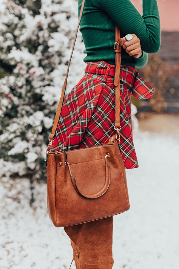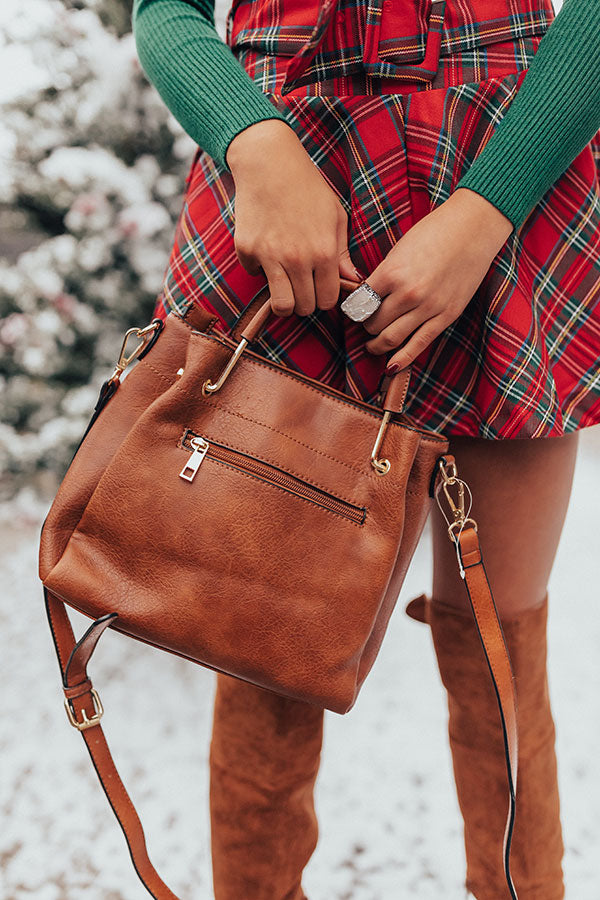 You are sure to look like a "style maven" when you accessorize with this brown tote featuring sleek faux leather material, two carrying handles, gold accents, an adjustable and removable crossbody strap, and a spacious fully lined pouch with a zip closure and additional inside pockets!