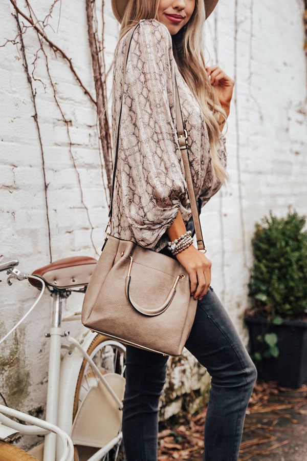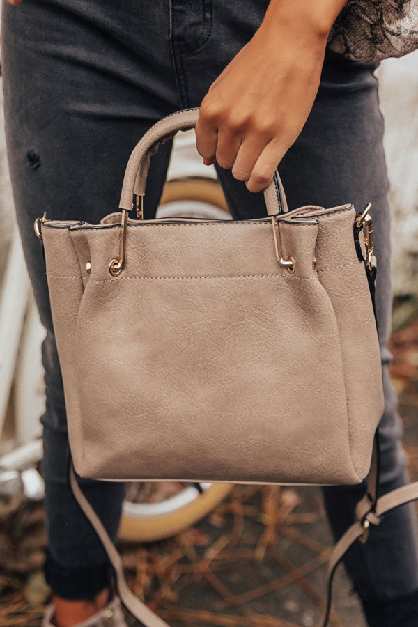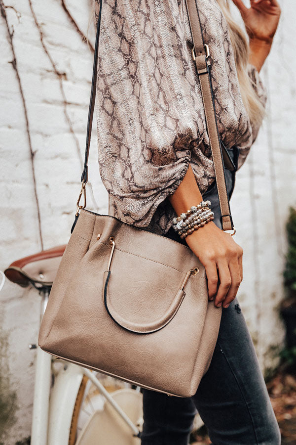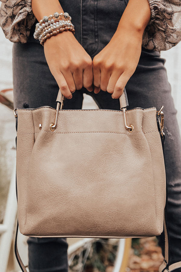 You are sure to look like a "style maven" when you accessorize with this taupe tote featuring sleek faux leather material, two carrying handles, gold accents, an adjustable and removable crossbody strap, and a spacious fully lined pouch with a zip closure and additional inside pockets!