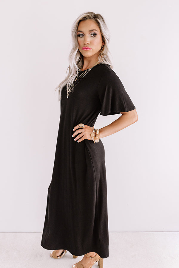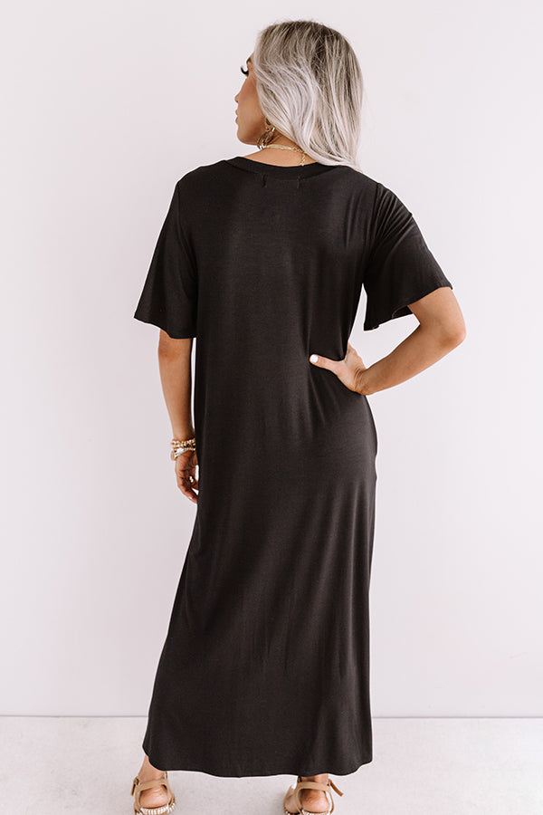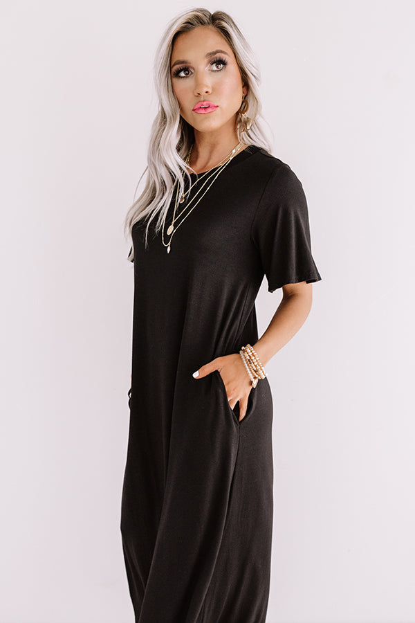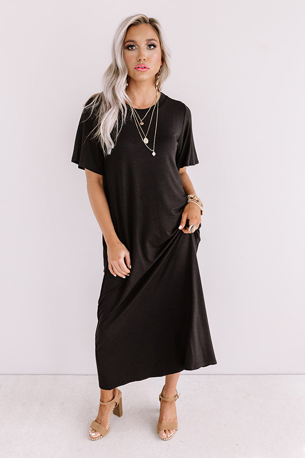 You are guaranteed to be everyone's "style muse" when you wear this chic black midi dress featuring soft lightweight breezy material, a high rounded neckline, short loose sleeves, accent side pockets, and an ultra relaxed silhouette that falls into a straight mid-calf length hemline! We have styled this cutie with some neutral heels and dainty gold jewelry, but you can also wear it layered under a cropped jean jacket with the "Steve Madden Philip Leopard Sneaker," our "Leopard Forever Headband," and our "Upstate Adventures Faux Leather Leopard Backpack in Brown!" Measurements