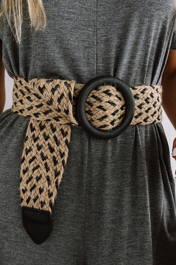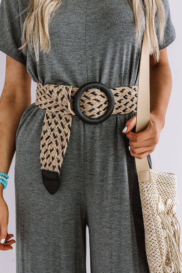You are sure to be everyone's "style muse" when you accessorize with this adorable belt featuring a wide tan and black woven strap and a large black circle belt buckle!