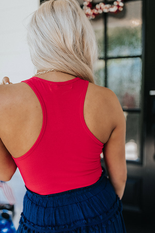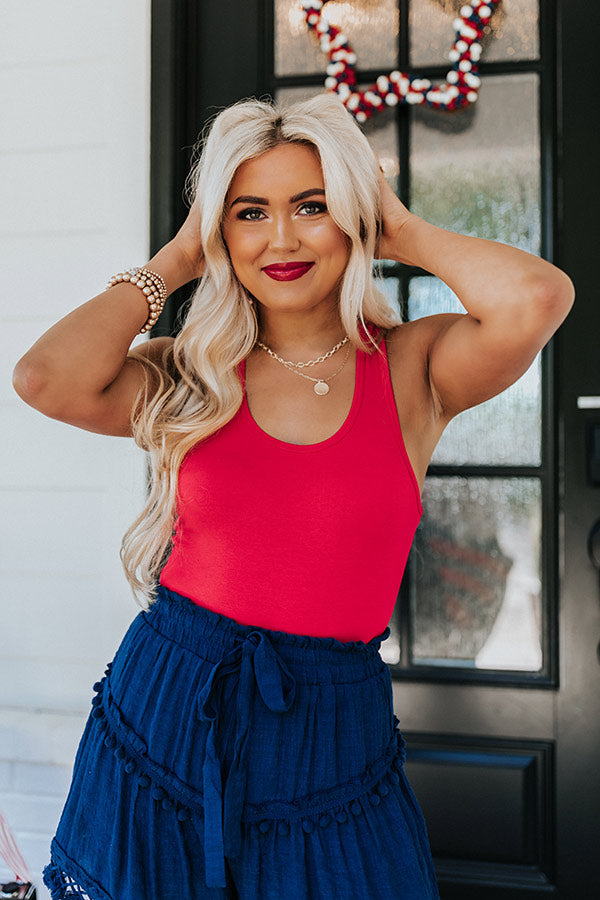 Seasons come and go, but a great transitional basic lasts forever! Our red 'Style Report' bodysuit is perfect for layering with its soft and stretchy lightweight material, a scooped neckline, 1-inch sleeveless shoulder straps with a racerback fit, and a form fitting silhouette that falls into a cheeky fit with a two snap button closure! Measurements
