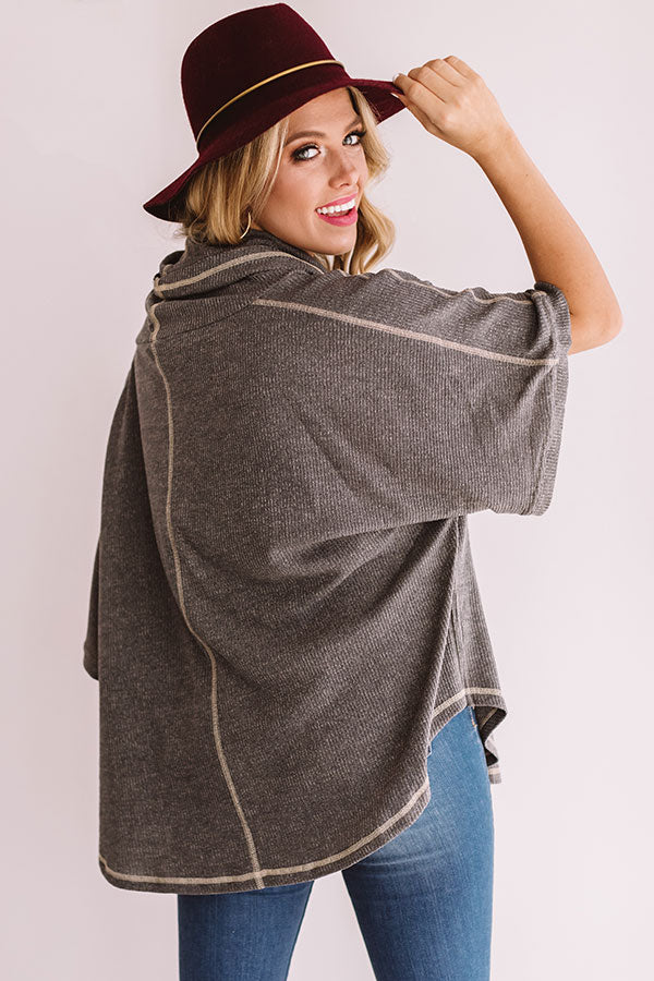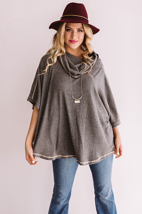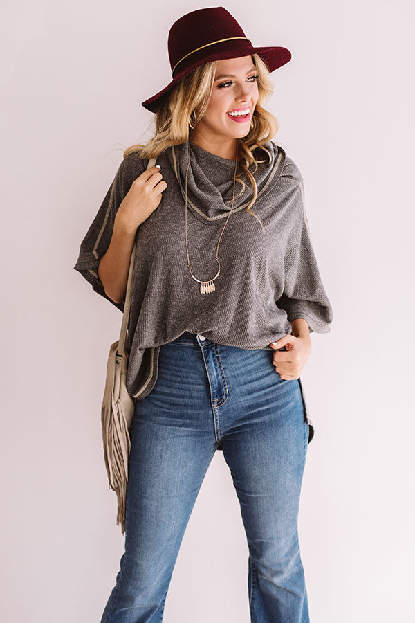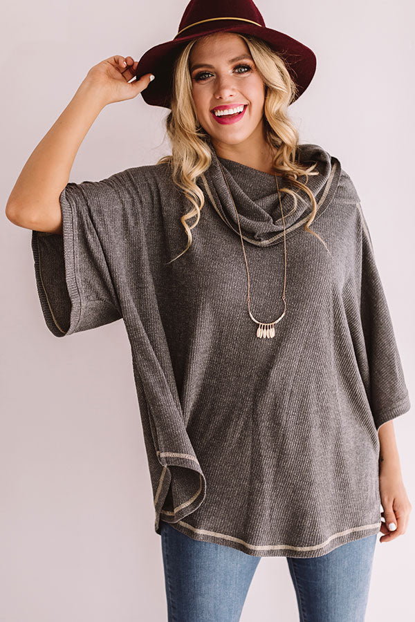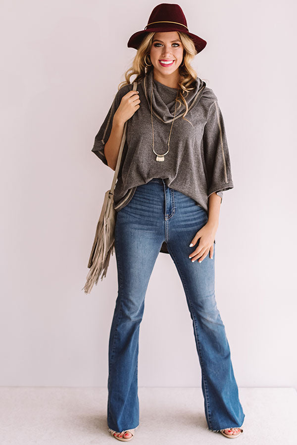 You will start a "style revival" when you wear this slate shift top featuring a ribbed texture, an oversized turtleneck, loose half length sleeves, light colored accent seams, and a flared bodice with a long rounded hemline! This versatile transitional piece can be styled with some denim flares, a neutral fringe crossbody, and a maroon faux suede hat, but it can also be paired with our "Sweet Victory High Waist Corduroy Skirt in Wine" and "The Farrah Peep Toe Bootie in Light Slate" for multiple sweater weather OOTDs! Measurements