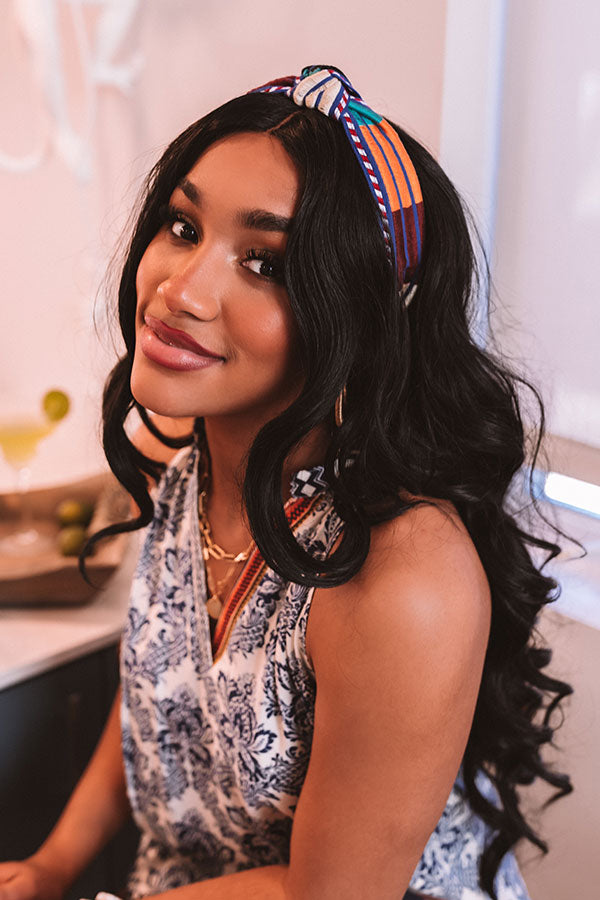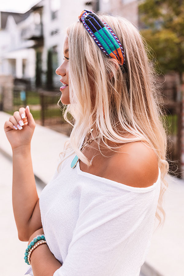 Top off your OOTD in the mos stylish way with our adorable 'Style Session Headband' featuring a lightweight blue and orange woven silhouette with an accent top knot!