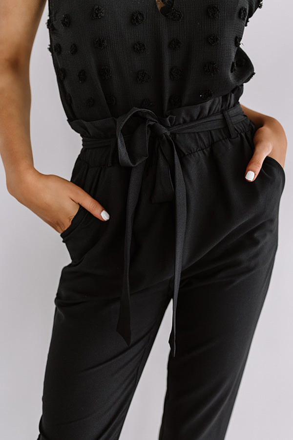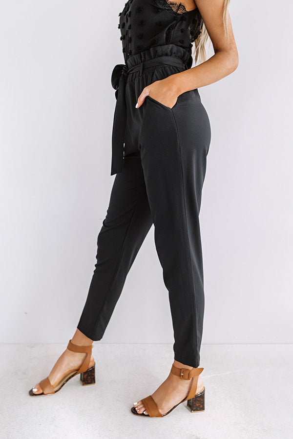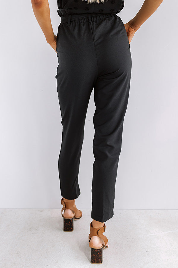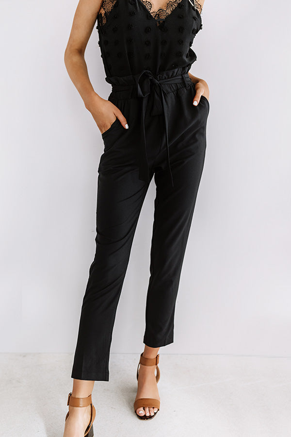 You are sure to have the ultimate "style session" when you wear these chic black trousers featuring lightweight material, a high waistline with a cinched appearance and a tie belt closure, accent side pockets, and a relaxed tapered pants silhouette that falls into straight floor length hemlines! You can style these cutie a variety of ways, like for the work day with a basic tank, white blazer, neutral heels, and a woven tote, or you can dress them down with our "Rock And Roll Tee in White," "The Pryor Faux Leather Peep Toe Bootie in Blush," and our "Mimosa Party Cat Eye Sunnies in Red!" Measurements
