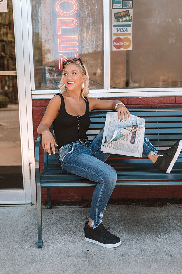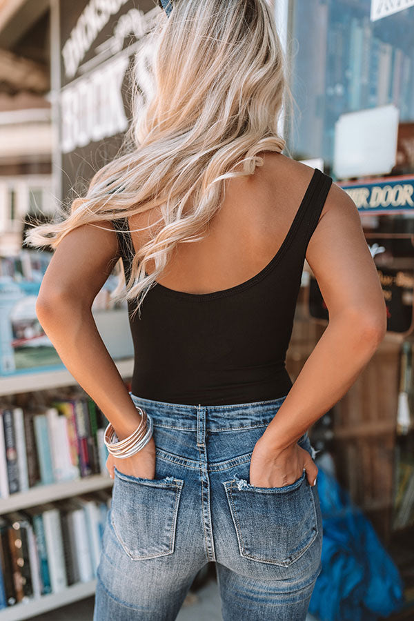 There is no doubt you will be a part of the style squad when you strut in this black bodysuit with its rounded neckline and button up front! Style with some trendy sneakers or strappy heels for an edgy but practical summer daytime look! Measurements