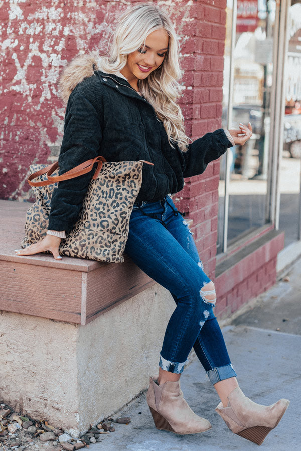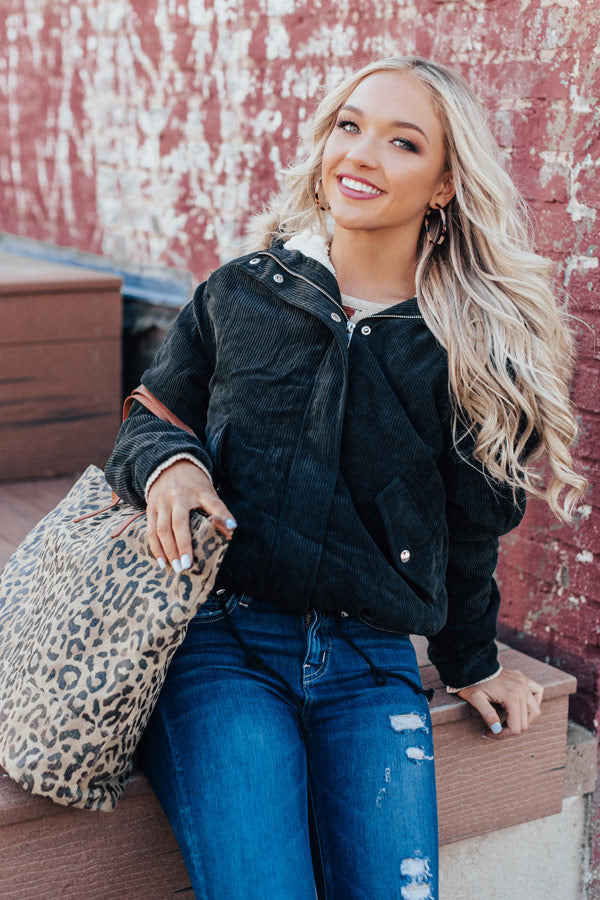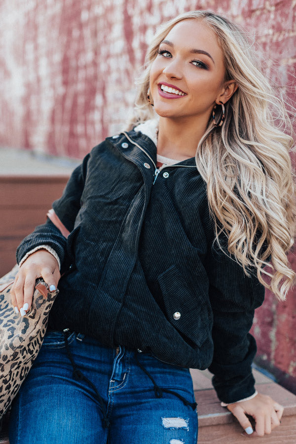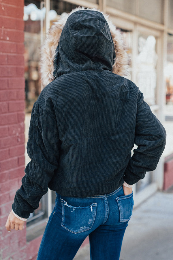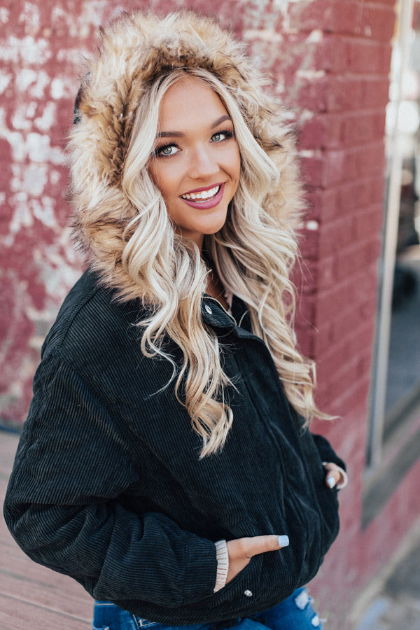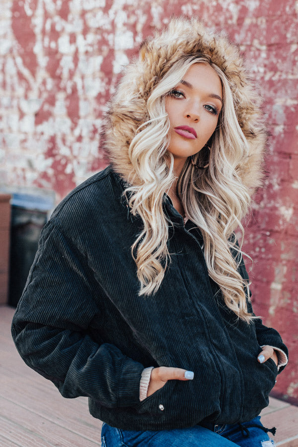 You will be "styled for snow" when you wear this chic black jacket featuring thigh corduroy material, a hooded back with faux fur trim, long loose sleeves with fitted cuffs, accent side pockets with flap closures, and a relaxed zip and button up front bomber silhouette that falls into a straight form fitting elastic hemline! You can style this versatile piece with just about anything from a basic tank to a sweater, jeans to skirts or dresses, booties to wedges or sandals, clutches to totes, and hats to earrings! Measurements