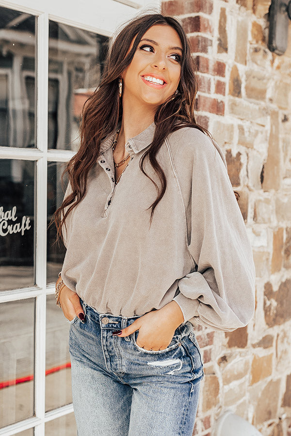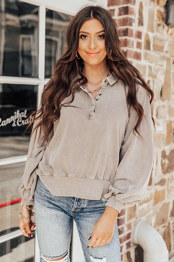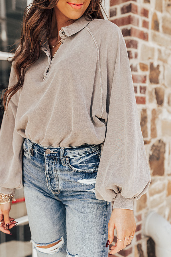 You will be styled out when you complete your look with this casual cute dark taupe hued sweatshirt featuring soft lightweight material, a button up bodice with a collared neckline, long oversized bubble sleeves with fitted cuffs, and a slouched silhouette that ends in a straight hemline!