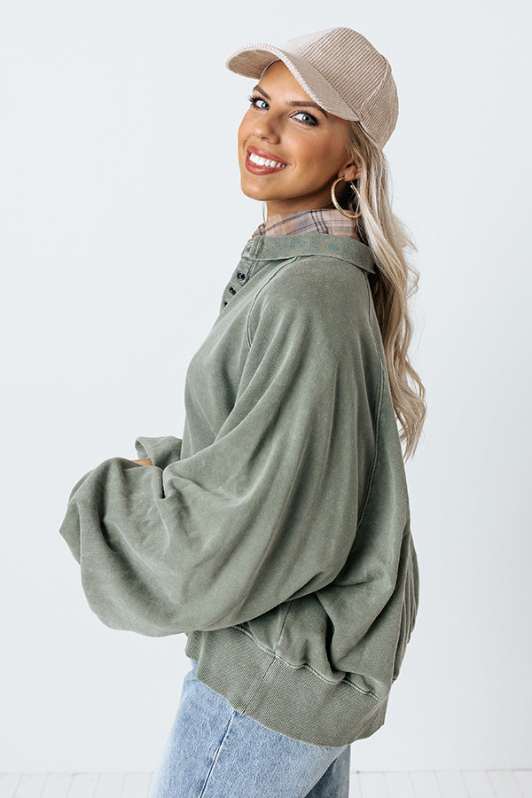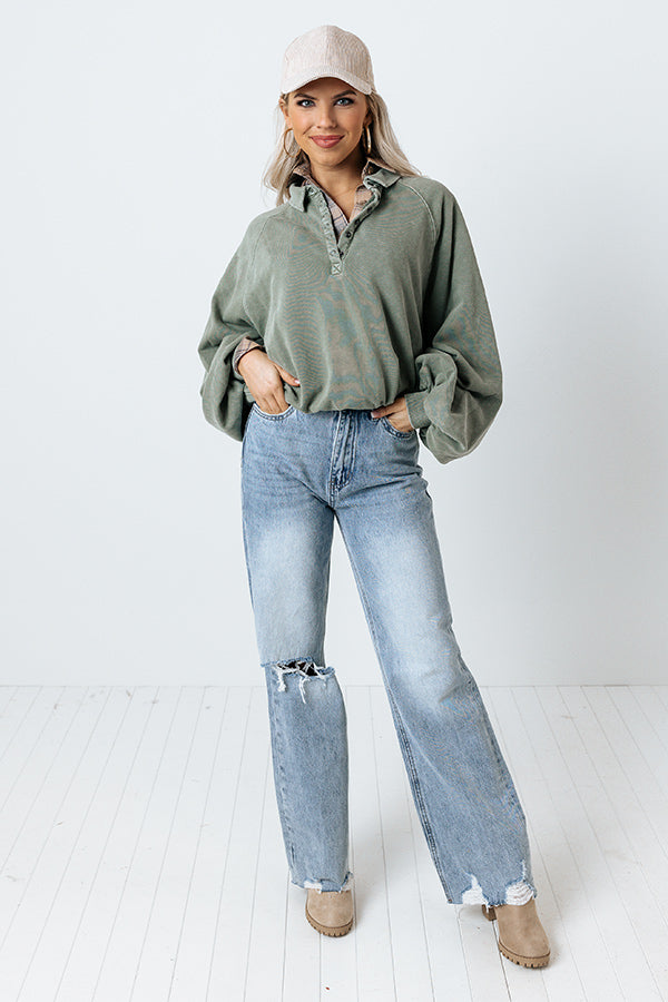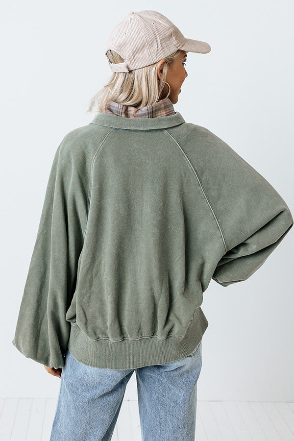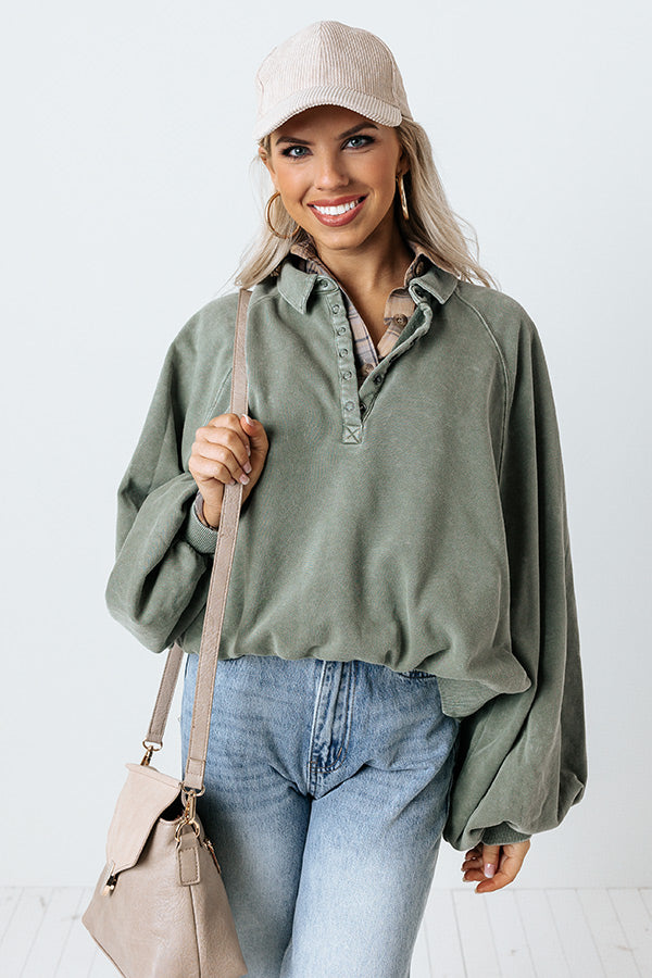 You will be styled out when you complete your look with this casual cute olive hued sweatshirt featuring soft lightweight material, a button up bodice with a collared neckline, long oversized bubble sleeves with fitted cuffs, and a slouched silhouette that ends in a straight hemline! Measurements