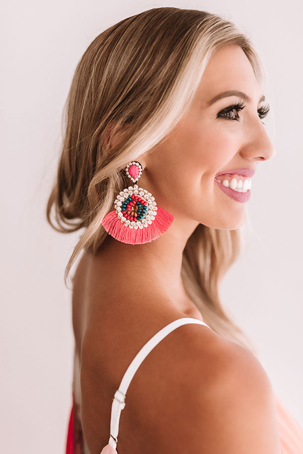 Your ears will be styled so pretty in these coral earrings with their hot pink diamond stud, colorfully beaded center, and bold tassel fan!