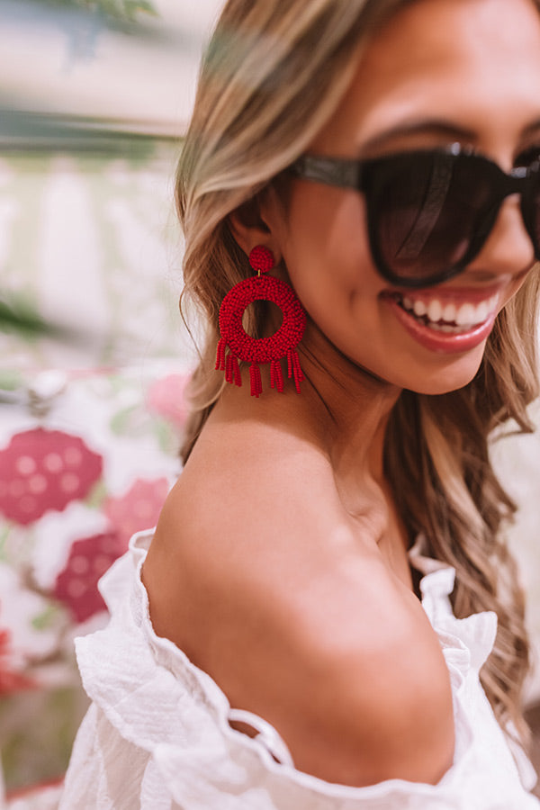 You will be "styled to perfection" when you accessorize with these adorable red statement earrings featuring beaded half ball studs and large dangling hoops with tassels!