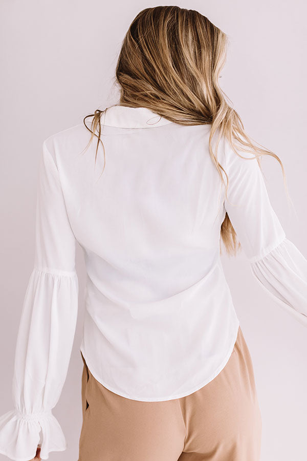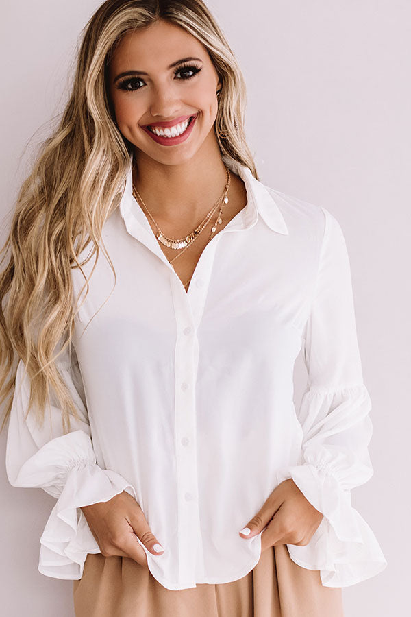 You will be "styled well" when you wear this white top featuring a button up front with a v-neck and collar, long bishop sleeves with elastic flared wrists, a straight fit silhouette, and a rounded hem! For more coverage, we recommend wearing with a bralette or white camisole underneath for a perfectly layered look. This feminine top can be styled with some neutral trousers and a black heel and crossbody for the ultimate girl boss look, or you can style it with some distressed skinnies and patterned accessories like our "Sloane Snake Print Bootie" and "Twist And Shout Snake Print Headband!" Measurements
