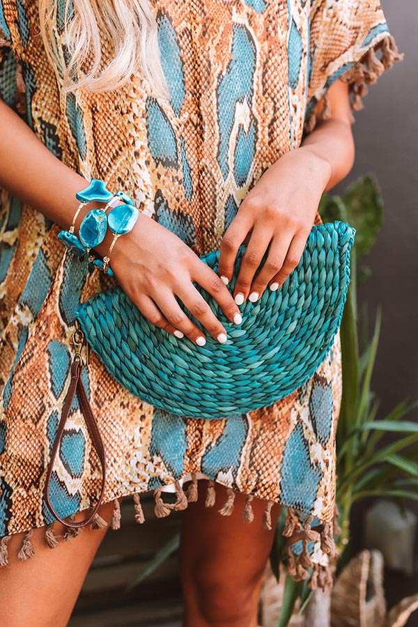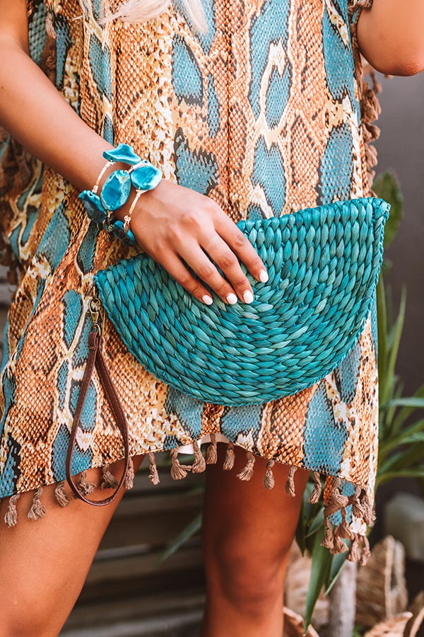 This adorable ocean blue clutch is "stylish by design" with its lightweight woven material, removable brown faux leather wrist strap, and half circle silhouette with a zip closure!