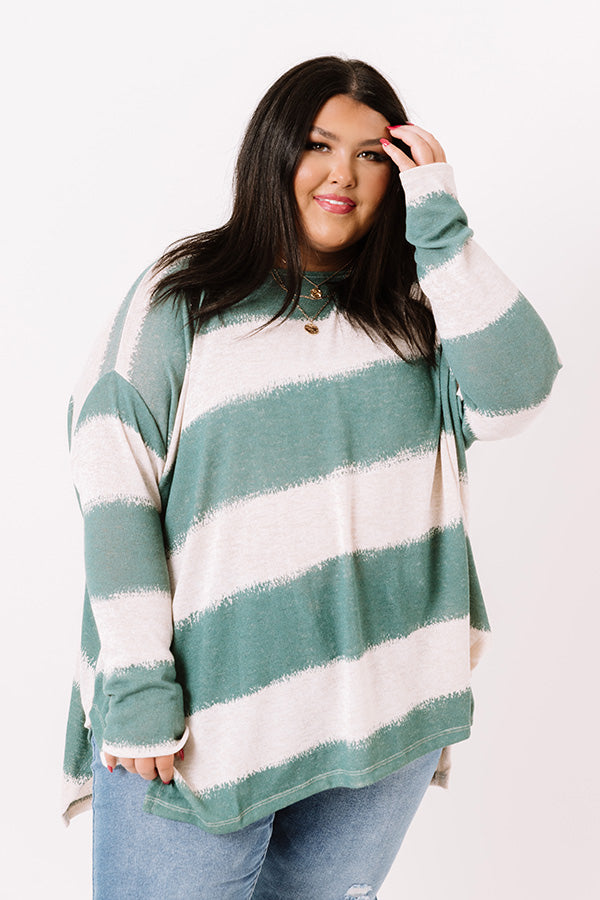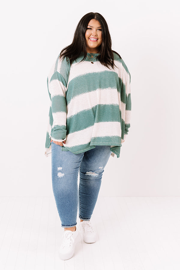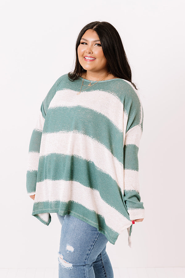 Plus Size - Stylish minds think alike...so I think we can all agree this adorable top is our new fave! It features soft lightweight tight knit material patterned with wide horizontal ivory and teal colored accent stripes, long sleeves, a high rounded neckline, and an ultra draped silhouette that falls into a straight tunic-length hemline with side slits! Measurements