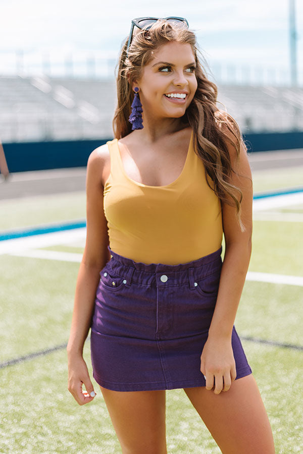 You will be known for having a stylish reputation at game day when you wear this mustard bodysuit featuring a scooped neckline, 1-inch shoulder straps, a low open back, form fitting bodice, lightweight material, and snap closure!