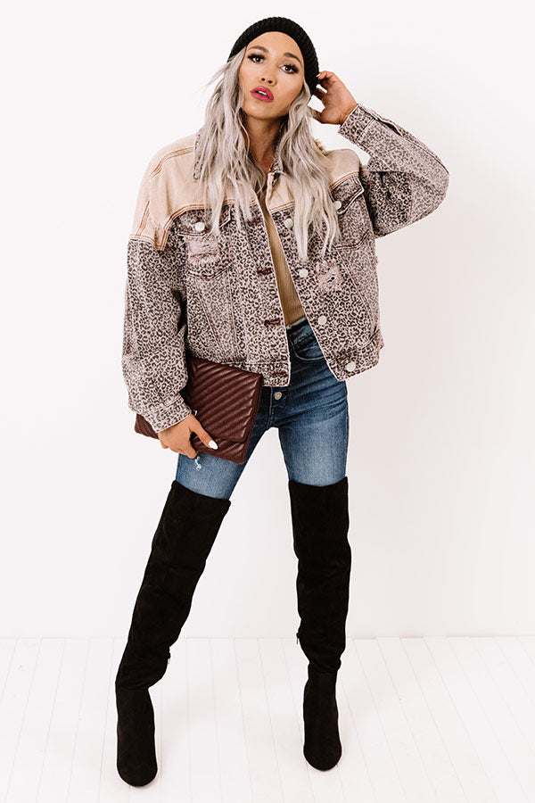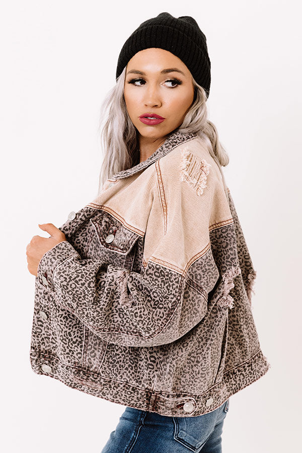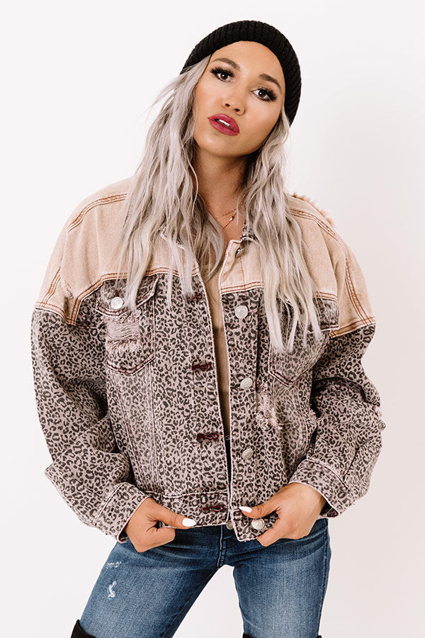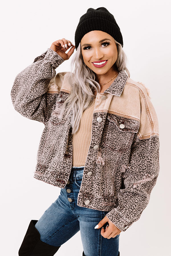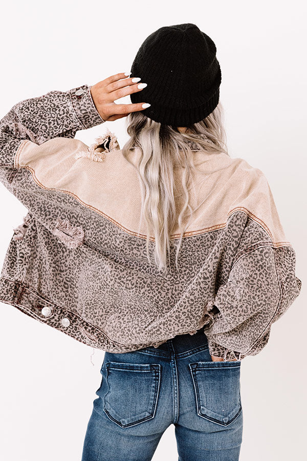 You are sure to gain a stylish reputation when you layer up with this unique jacket featuring lightweight denim material patterned with a faded leopard print and neutral shoulders, distressed detailing, two accent chest pockets with flap closures, long loose sleeves with button closure cuffs, a button down front with a collared neckline, and a slouched silhouette that ends in a straight hemline! Measurements