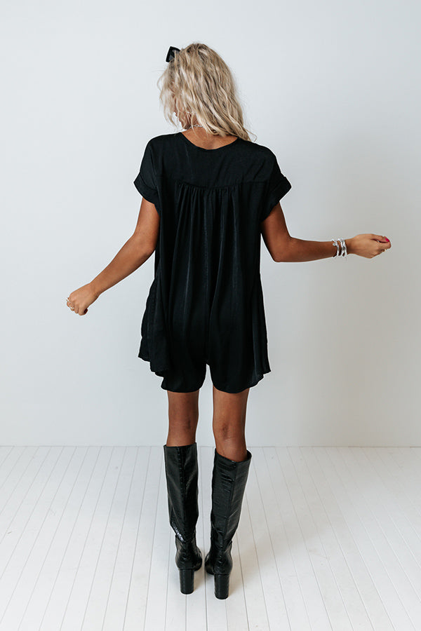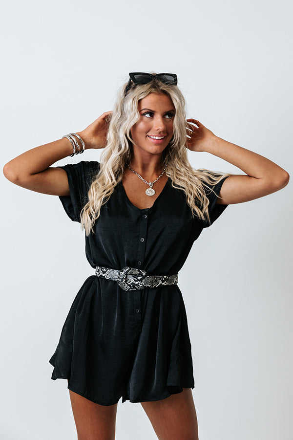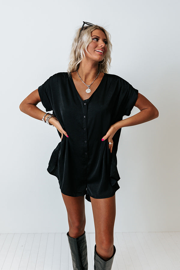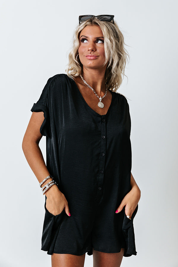 You will be channeling some majorly stylish vibes when you wear this adorable black romper featuring sleek lightweight and breezy material, a button down front with a v-cut neckline, short sleeves with rolled cuffs, hidden side pockets, and a slouched shorts silhouette that falls into uneven upper-thigh length hemlines! Measurements