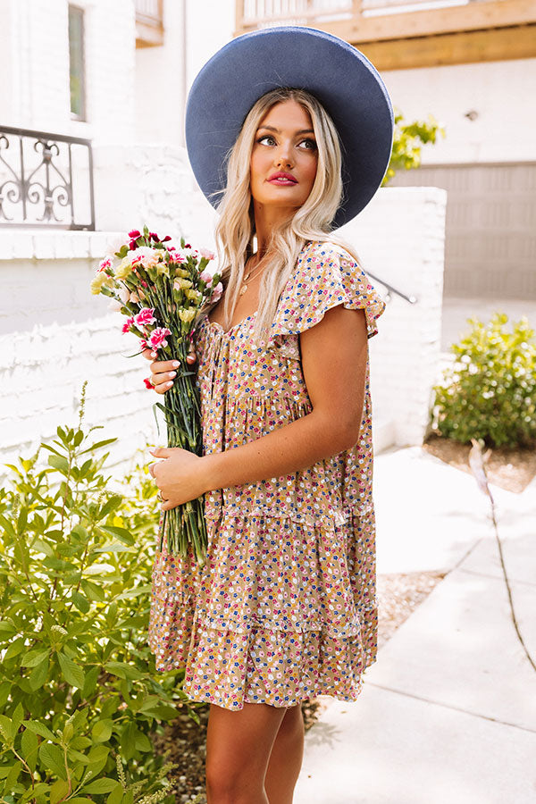 You will successfully look chic when you complete your look with this charming iced latte shift dress featuring lightweight breezy material patterned with a blue, pink, and yellow floral print, a scooped neckline with a tie closure, ruffled accent seams, flirty cap sleeves, and a relaxed silhouette that falls into a straight mid-thigh length hemline!