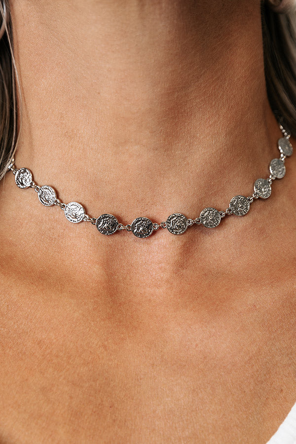 Accessorize in luxury with this delightful necklace featuring a small silver coin charm choker!