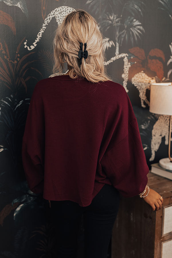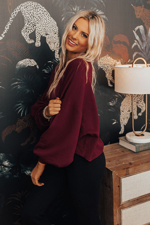 It will be such a delight when you complete your look with this cozy maroon hued casual cute sweatshirt featuring soft lightweight material, a rounded neckline, long oversized sleeves with fitted cuffs, and a relaxed silhouette that ends in a straight raw-cut hemline! Measurements