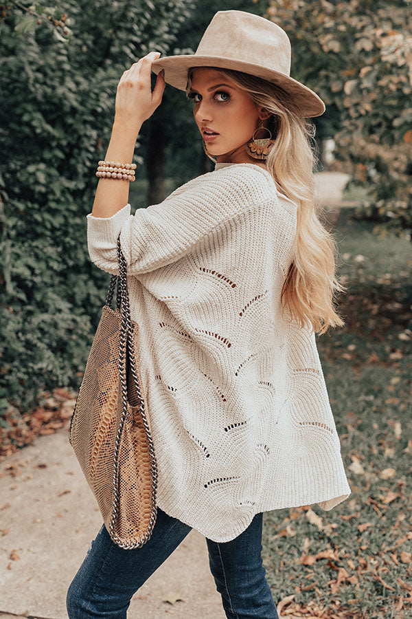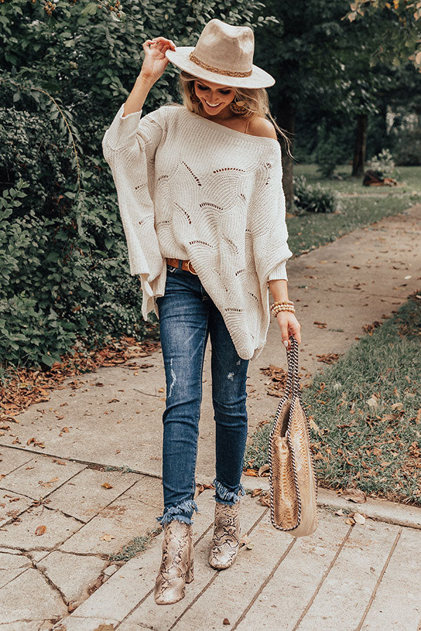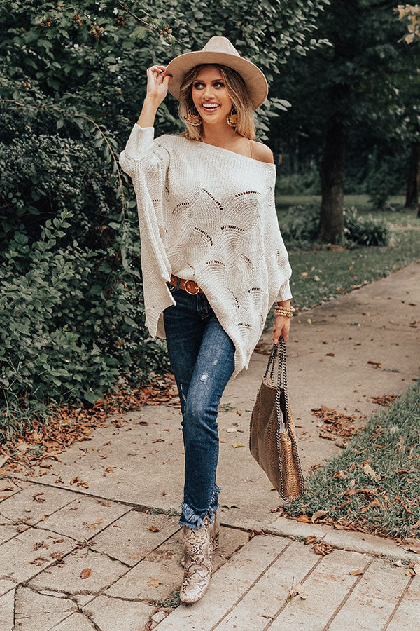 Sugar, snuggles, spice, and all that is nice, that is what cozy sweater dreams are made of! This cream colored cutie features a wide rounded neckline that can be worn off of one shoulder, quarter length bat wing sleeves with fitted ribbed cuffs, and a relaxed eyelet pierced chenille knit bodice that falls into a tunic length uneven hemline! We have styled this adorable fall essential front tucked into some distressed ankle skinnies, a statement belt and earrings, a faux suede hat, and a snake print bootie and tote, but you can also wear it with our "Sweet Victory High Waist Corduroy Skirt in Wine" and "The Whitley Faux Suede Thigh High Boot in Taupe!" Measurements