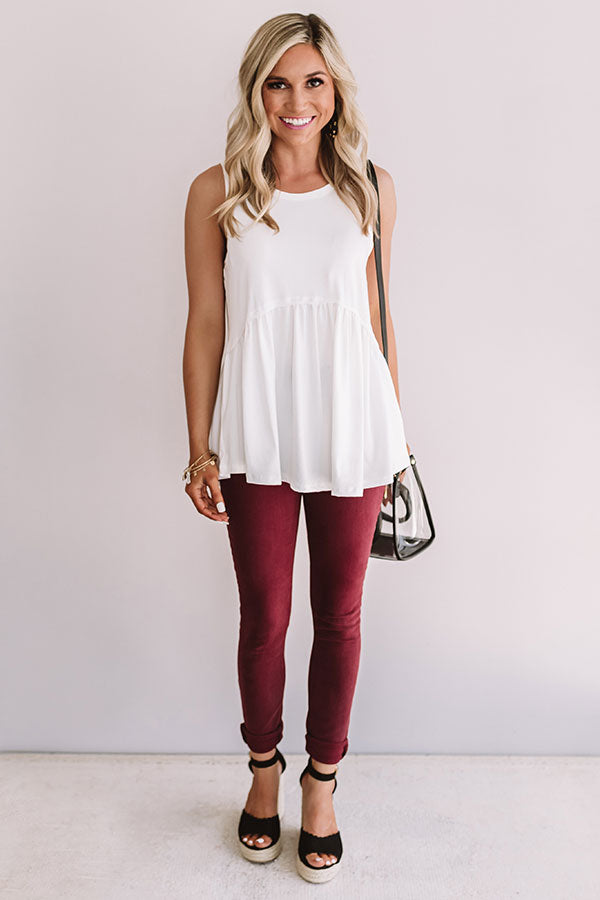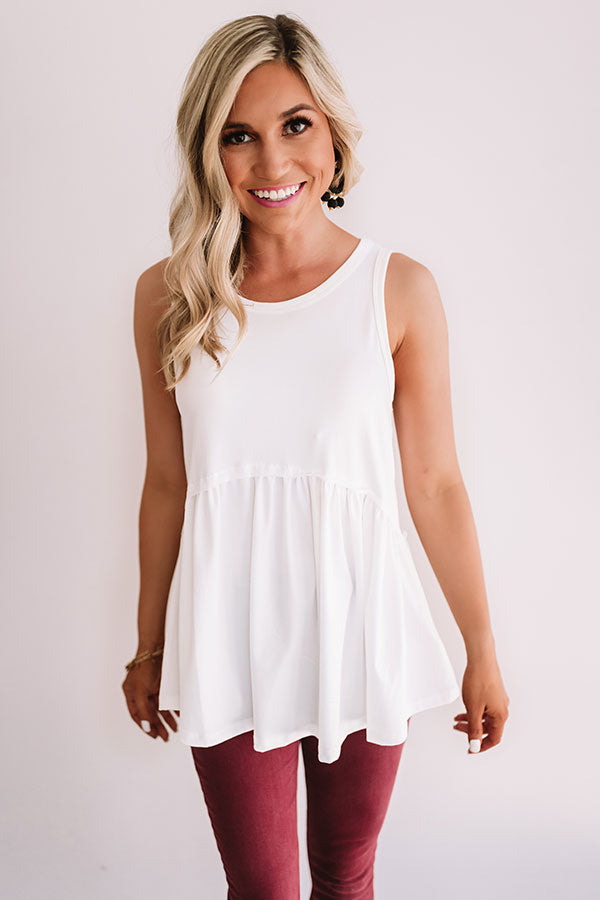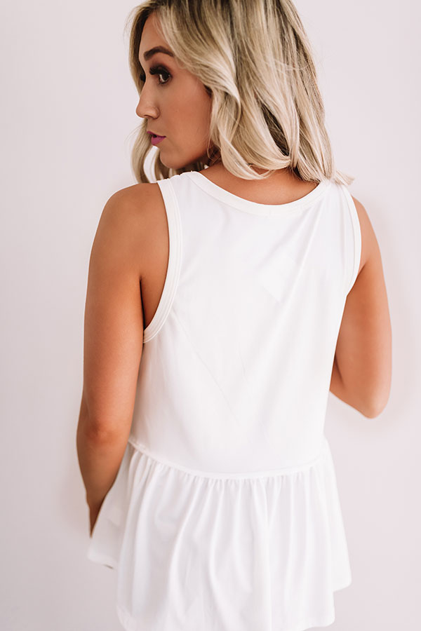 Live every hour like it's happy hour in the "Sugar And Spritzers Babydoll Top" with its loose peplum bottom, soft stretchy material, rounded neckline, and 1-inch straps! This white piece styles wonderfully with distressed denim, nude heels, a straw tote with a bag scarf, and a faux suede hat, or you can wear it on game day with some maroon skinnies and a black wedge and transparent crossbody! Measurements