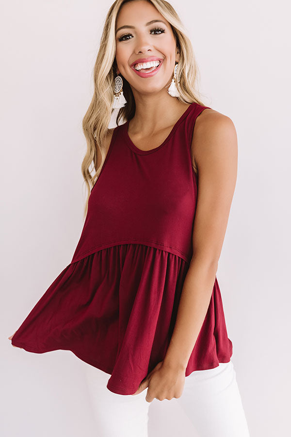 Live every hour like it's happy hour in the "Sugar And Spritzers Babydoll Top" with its loose peplum bottom, soft stretchy material, scooped neckline, and 1-inch straps! For a fashionable game day look, this wine piece styles wonderfully with distressed white skinnies, heels, statement earrings, and a clear crossbody, but for a more everyday look, you can pair this cutie with "The Clara High Waist Distressed Shorts" and "The Delaney Sneaker in Leopard!" Measurements