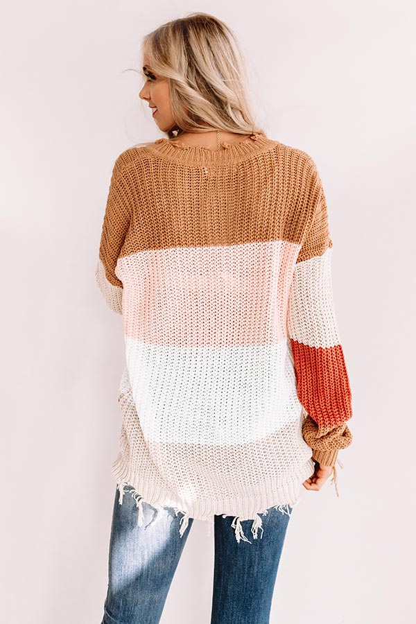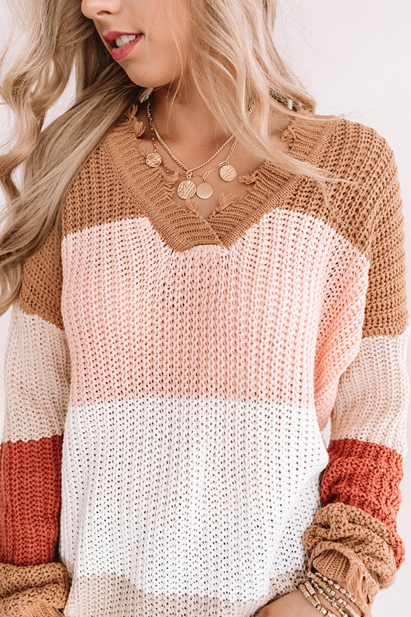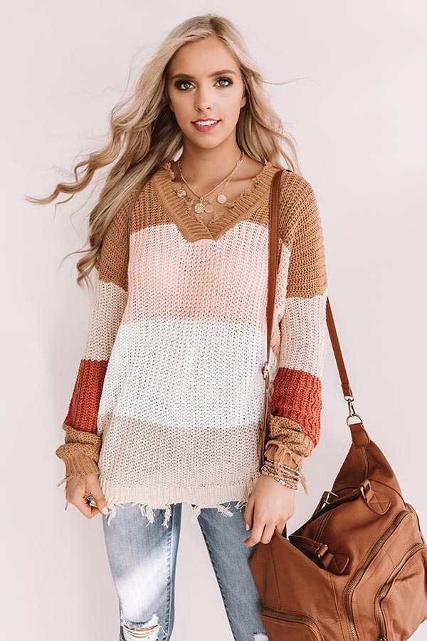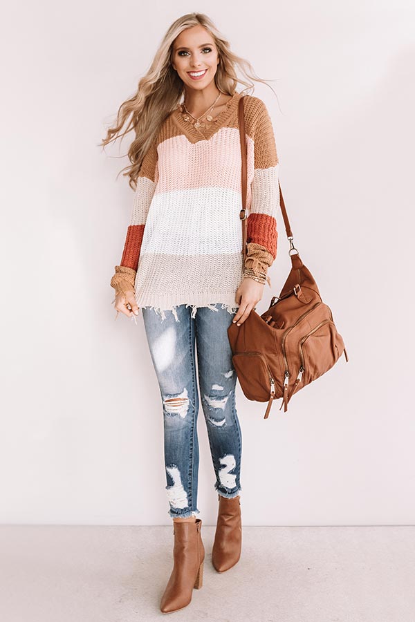 When the leaves are falling and autumn is calling, cozy up in our "Sugar Mountain" sweater featuring lightweight large knit material with subtle ribbed texturing, horizontal color block stripes, distressed trim detailing, a v-cut neckline, long loose sleeves, and a relaxed silhouette that falls into an uneven hemline! We have styled this piece with some distressed ankle skinnies and a neutral bootie and tote, but you can also wear it front tucked into our "Positive Vibes Faux Suede Skort in Camel" with "The Pryor Faux Suede Peep Toe Heel in Blush" and our "Say It Ain't Soho Hat in Rust!" Measurements