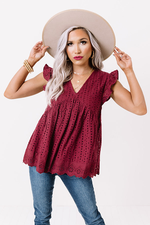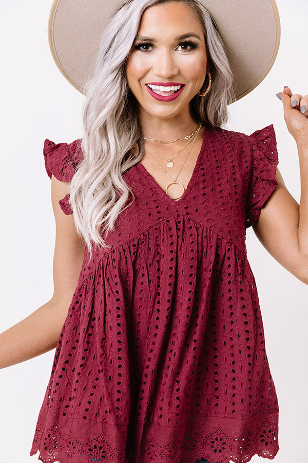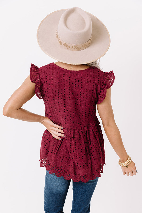 Sweeten up your fall wardrobe with our charming wine colored "Sugar Pie" top featuring lightweight material with intricate eyelet detailing throughout, a v-cut neckline, wide 2-inch sleeveless shoulders with ruffled trim detailing, and a relaxed babydoll silhouette that falls into a scalloped hemline!