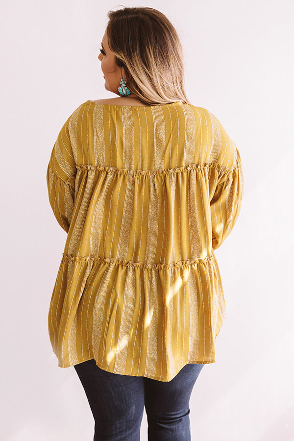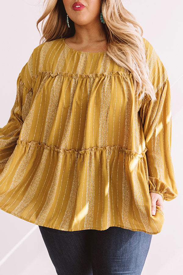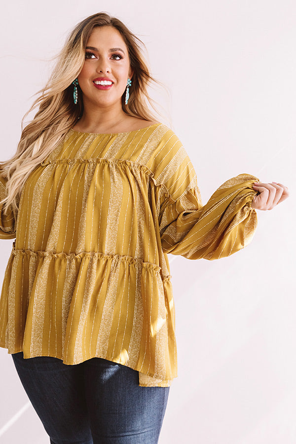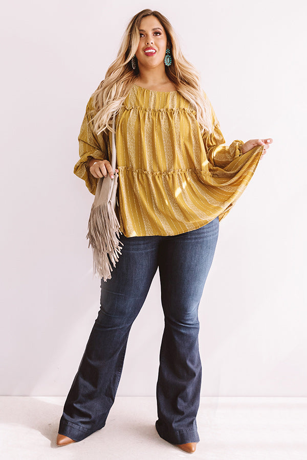 Plus Size - Transition to fall in style with our mustard colored "Sugar, Spice, and Everything Nice" shift top featuring lightweight material with a subtle white vertical stripe pattern, a high rounded neckline, tiered detailing with ruffle accent seams, long oversized bishop sleeves with fitted elastic banded cuffs, and a relaxed silhouette that falls into a rounded tunic length hemline! We have styled this cutie with some dark wash flares, booties, and a neutral fringe crossbody, but you can also wear it with some distressed light wash skinnies, "The Jess Faux Leather Heel in Natural," and our "All CaughtUp Headband in Ivory!" Measurements