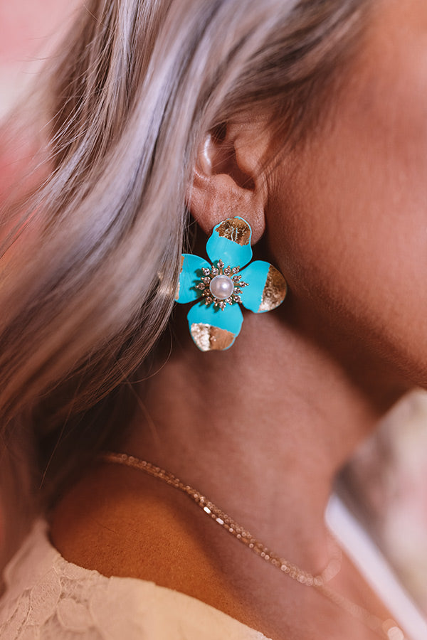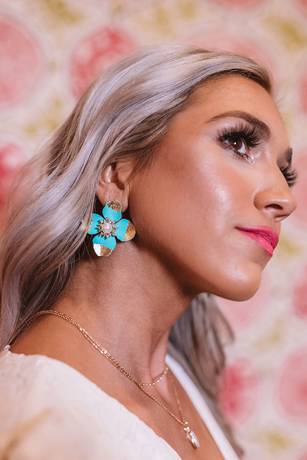 You will undoubtedly steal the show when you accessorize with our adorable "Suite By The Sea" statement earrings featuring large ocean wave colored flowers with gold tip detailing and pearl and rhinestone centers!