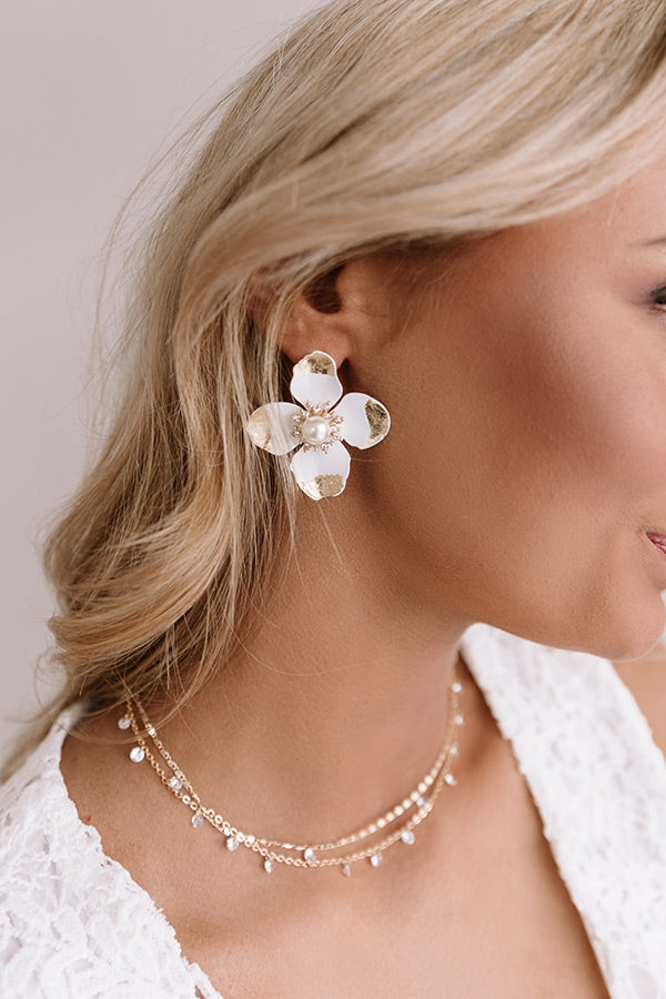You will undoubtedly steal the show when you accessorize with our adorable "Suite By The Sea" statement earrings featuring large white flowers with gold tip detailing and pearl and rhinestone centers!