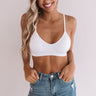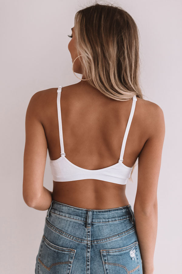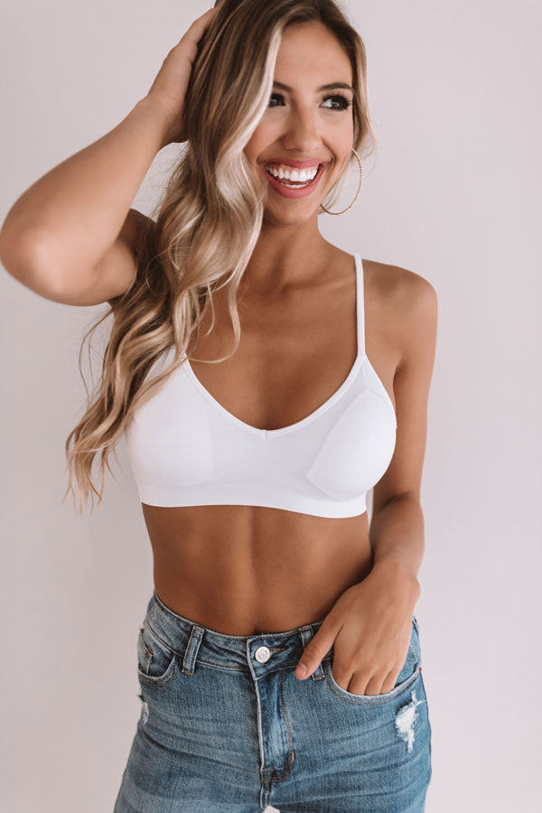 Perfect for wearing everyday, our simple white 'Suite Life' bralette features lightweight four-way stretch seamless material, a v-cut neckline with adjustable spaghetti straps, and a flattering triangle silhouette that ends in a straight hemline! This bralette has padding that is removable.