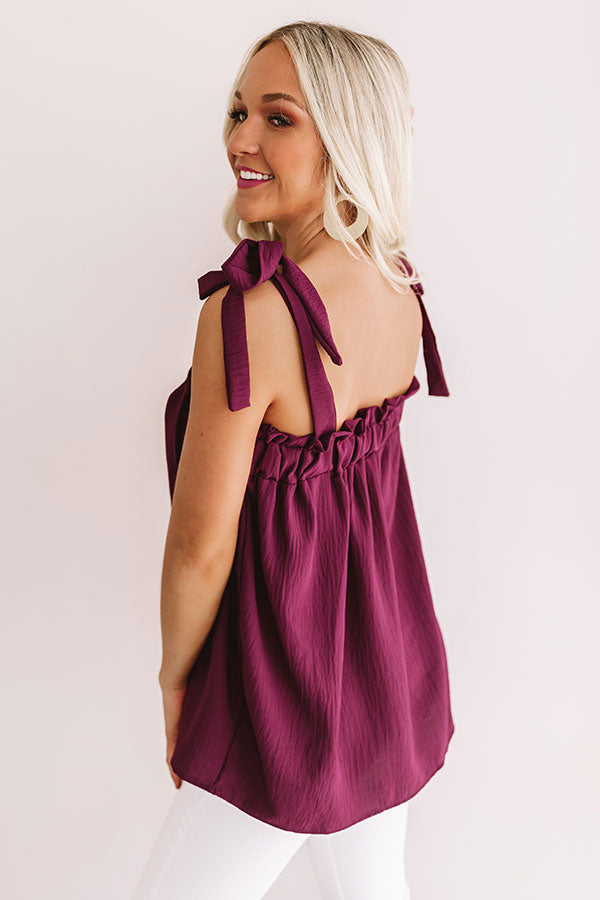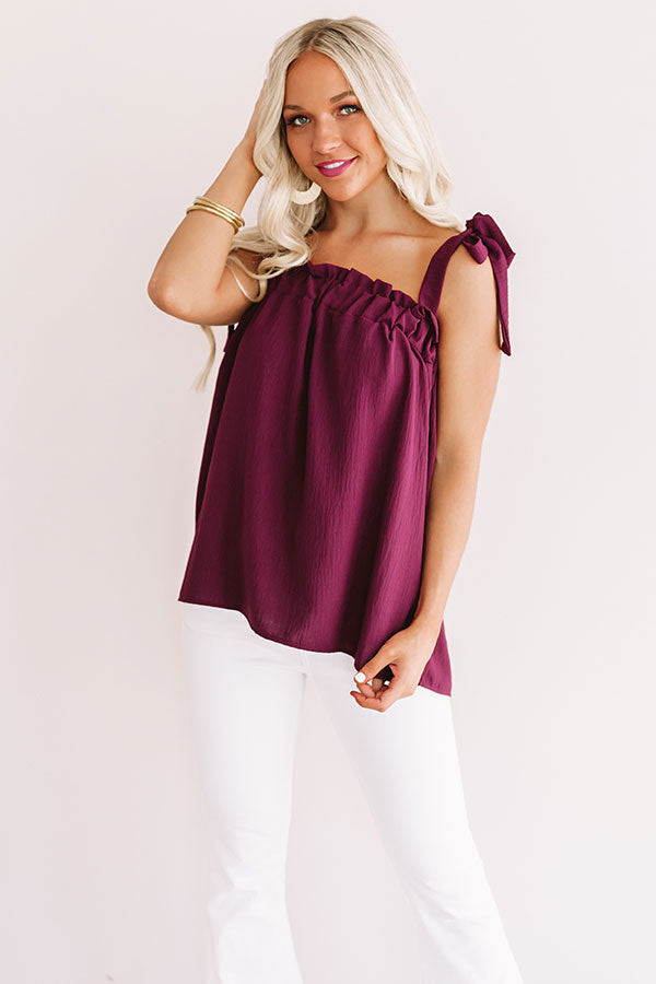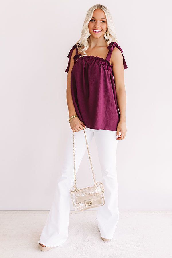 All eyes will be on you when you wear this merlot shift tank featuring tied straps, smocked ruffled neckline, and flowy bodice! You can style this piece with some white flares, wedges, and a transparent crossbody for the perfect gameday look or with "The Milo High Waist Distressed Shorts," our "After Hours Snake Print Clutch," and "The Britton Snake Print Bootie" for a more everyday outfit that will have everyone captivated by you instead of that "suite with a view!" Measurements