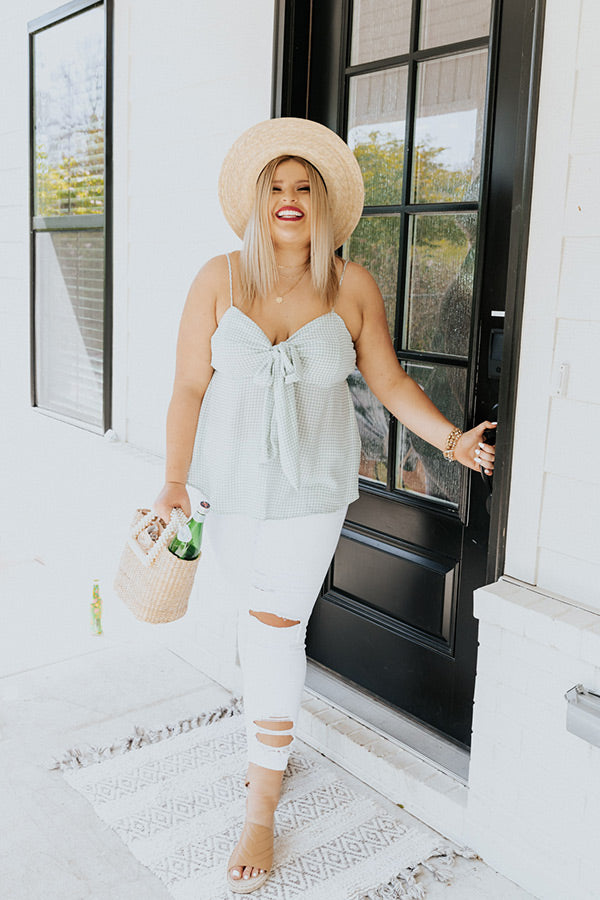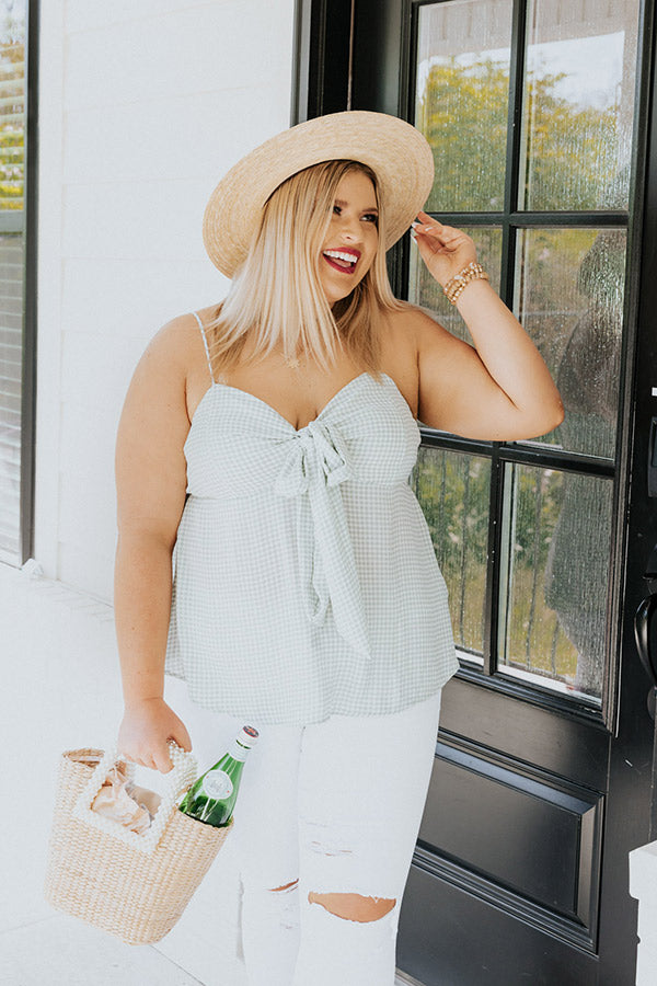 Plus Size - Escape into summer with this darling tank featuring lightweight flowy material patterned with a small white and pear hued gingham print, a flattering sweetheart neckline with a tie closure, adjustable spaghettis traps, and a relaxed silhouette that falls into a straight hemline!