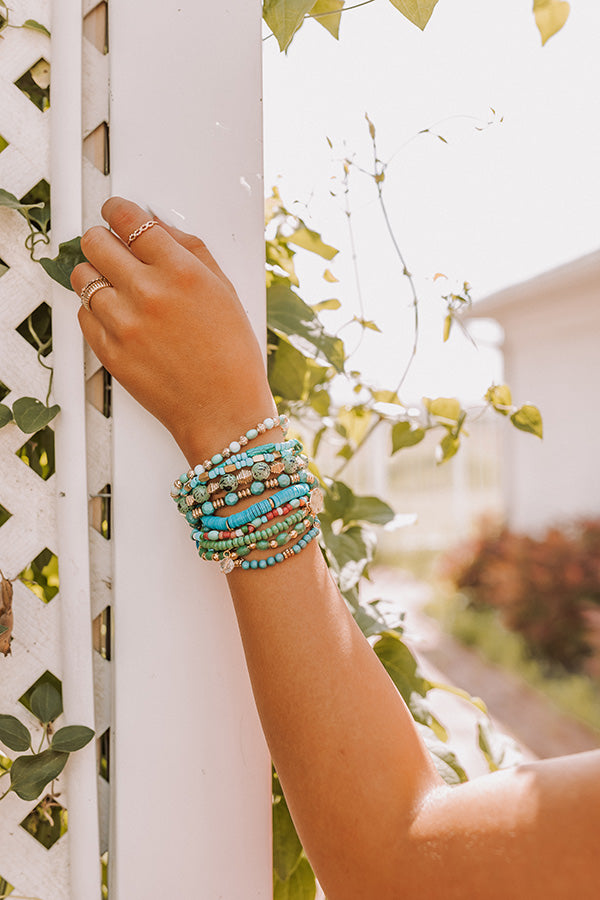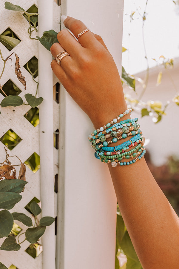 Add a fun summer accessory to your look with this bracelet set featuring ten turquoise, green, and gold beaded stretch bands!